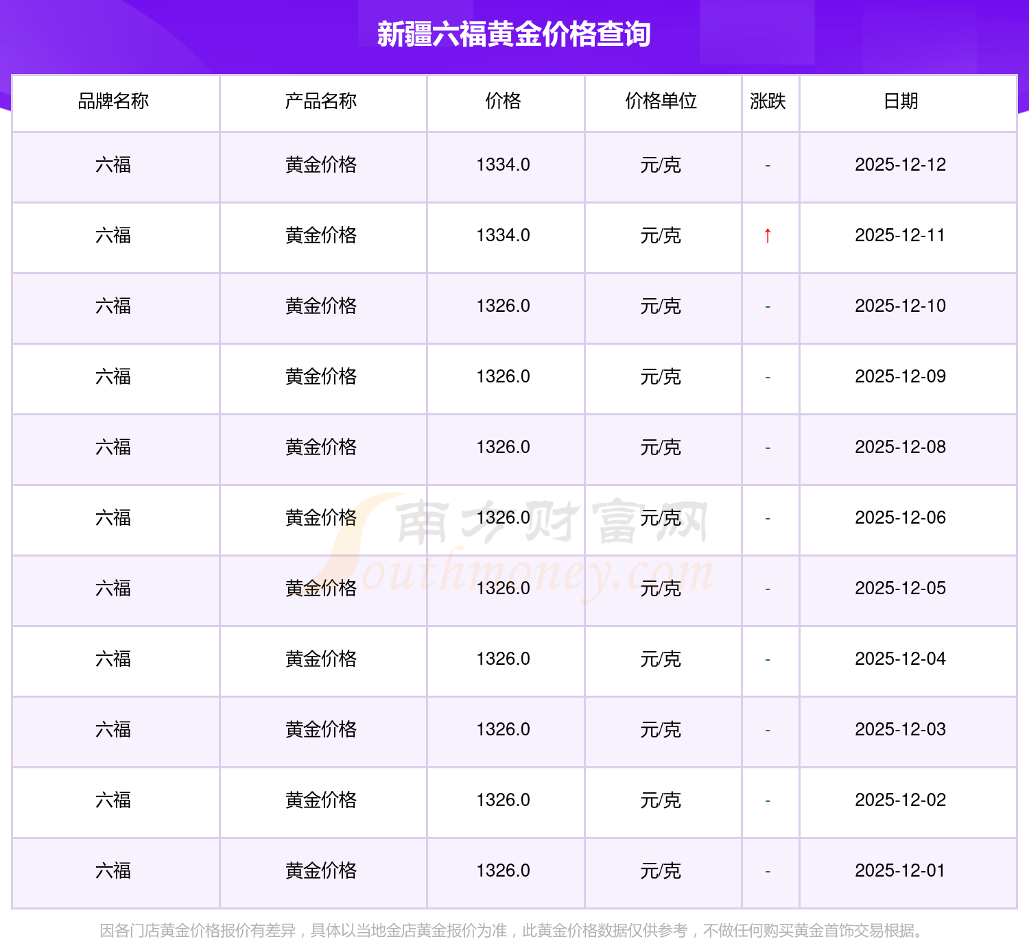新疆六福在 2025年12月14日的黄金价格零售价格为 1334.0元/克。