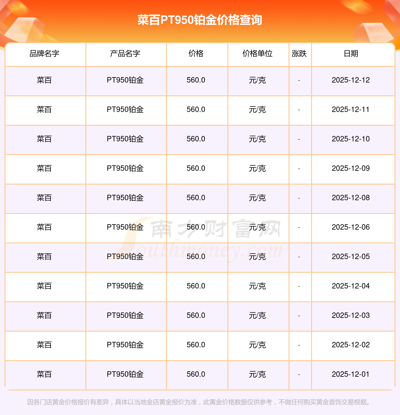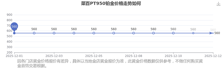 2025年12月14日菜百PT950铂金价格是560.0元/克。