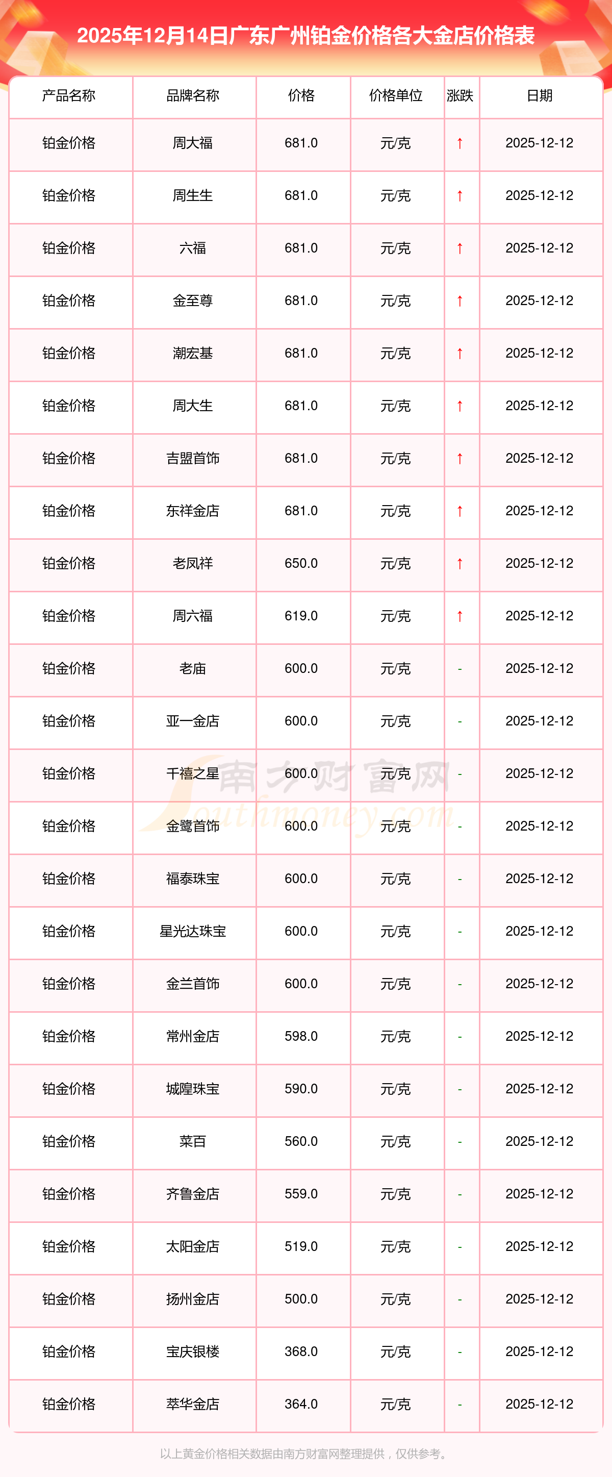 2025年12月14日广东广州各金店铂金价格最新一览表