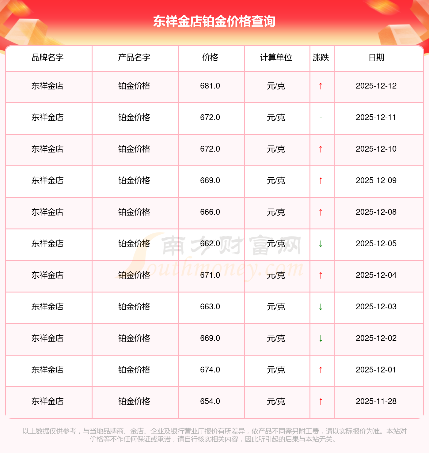 东祥金店 铂金价格于今日的最新挂牌价为681.0元/克。
