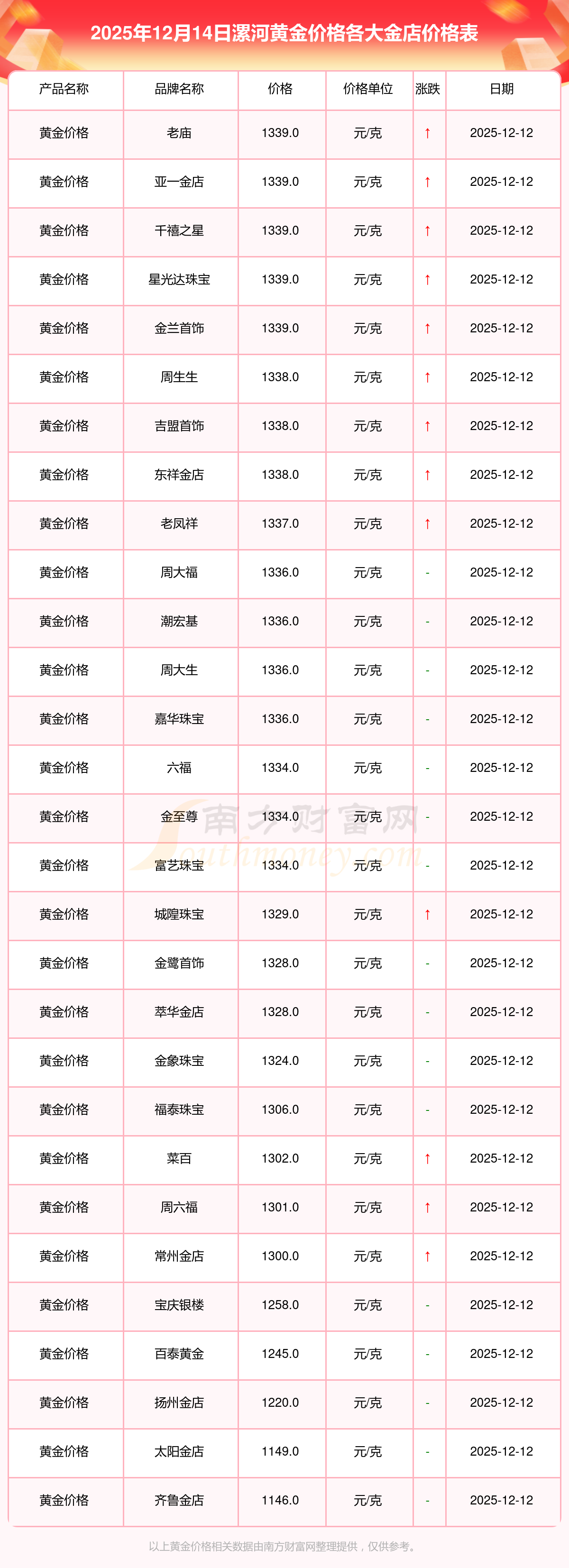 今天是2025年12月14日,漯河周大福、周大福、老凤祥、老凤祥、老庙、老庙、周生生、周生生、周大福、周大福、周大福等各大金店品牌黄金价格最新价格行情是这样的:周大福1336.0元/克、周大福681.0元/克、老凤祥1337.0元/克、老凤祥650.0元/克、老庙1339.0元/克、老庙600.0元/克、周生生1338.0元/克、周生生681.0元/克、周大福1336.0元/克、周大福47410.0、周大福19550.0。
