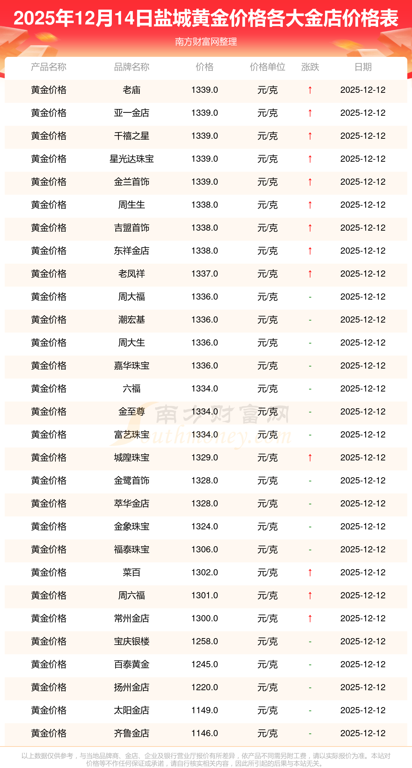 今天是2025年12月14日,盐城周大福、周大福、老凤祥、老凤祥、老庙、老庙、周生生、周生生、周大福、周大福、周大福等各大金店品牌黄金价格最新价格行情是这样的:周大福1336.0元/克、周大福681.0元/克、老凤祥1337.0元/克、老凤祥650.0元/克、老庙1339.0元/克、老庙600.0元/克、周生生1338.0元/克、周生生681.0元/克、周大福1336.0元/克、周大福47410.0、周大福19550.0。