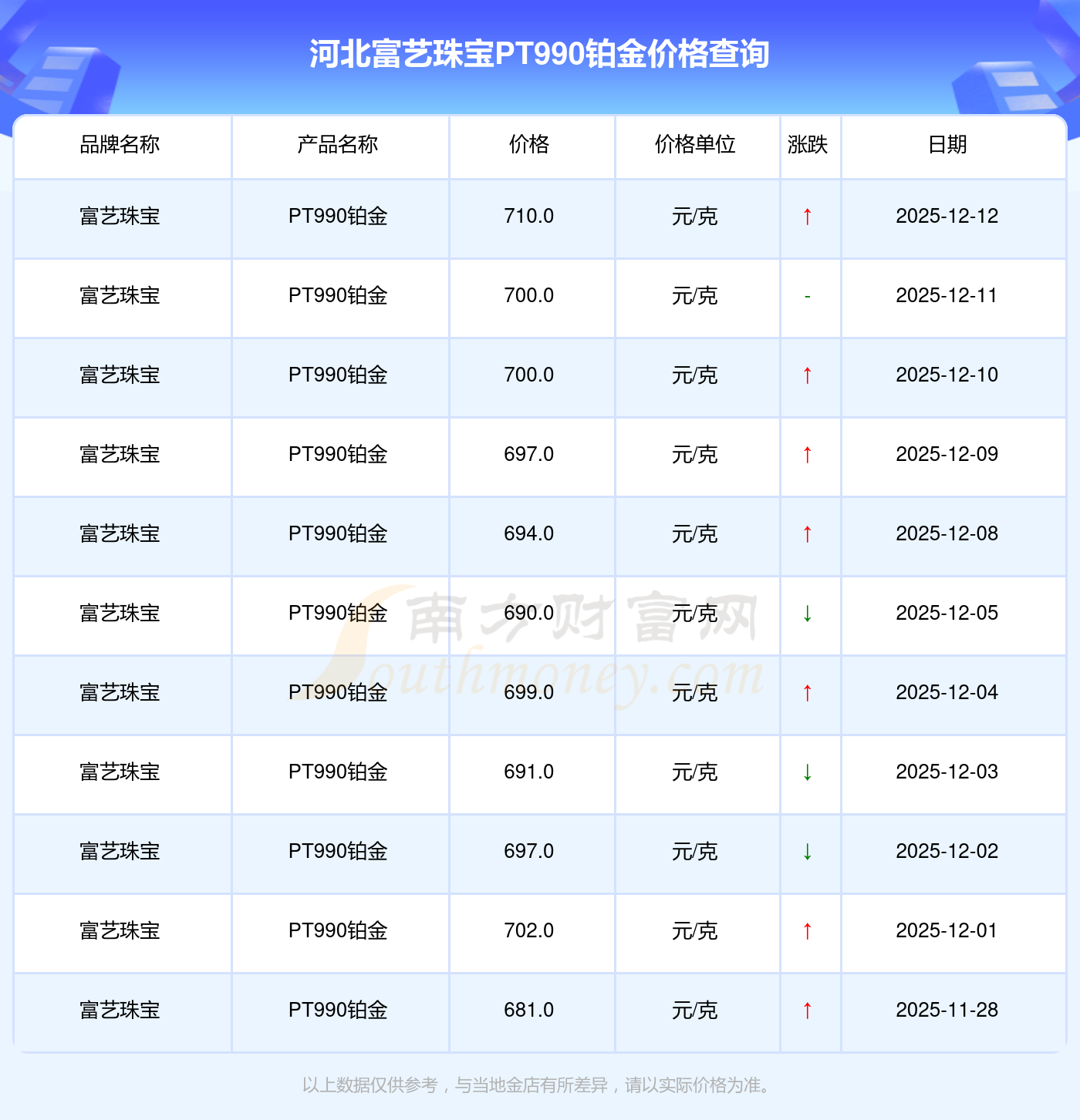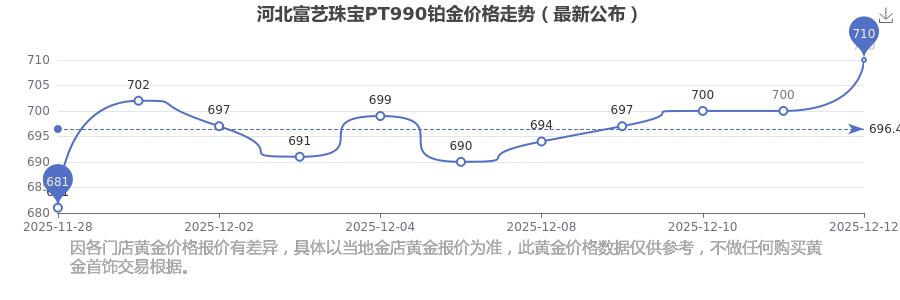今日(2025年12月14日)河北富艺珠宝PT990铂金价格是710.0元/克。