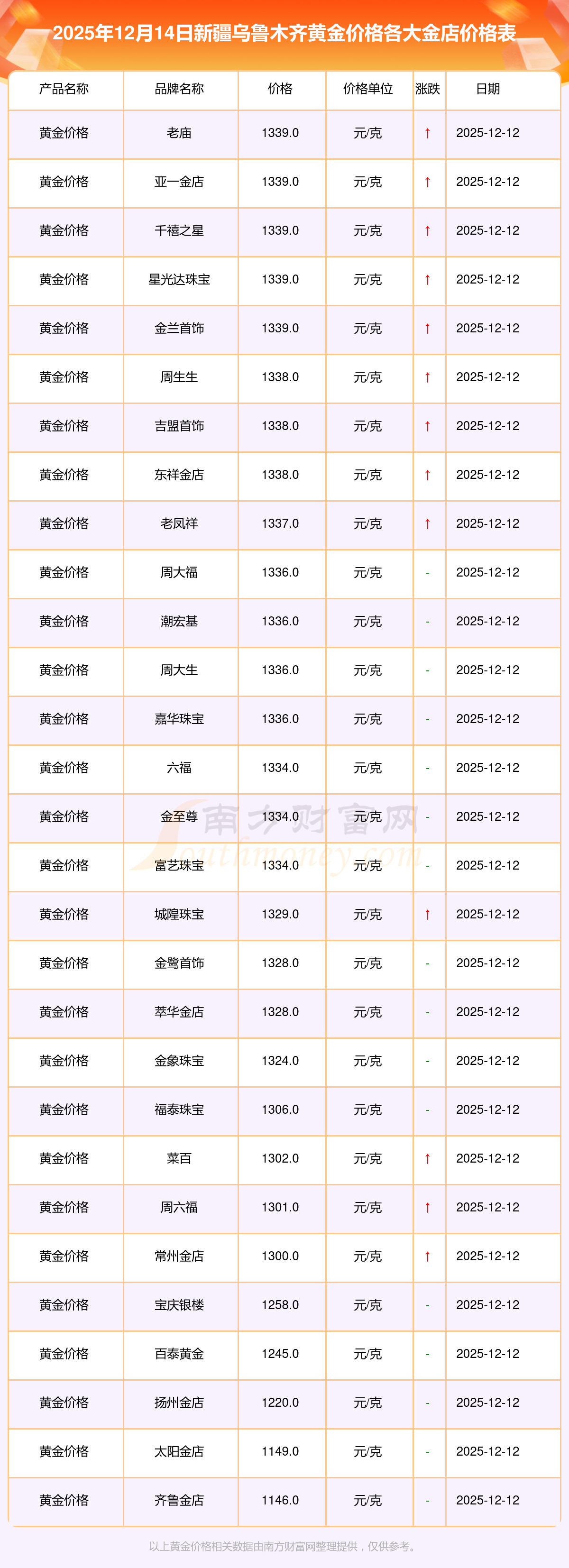今天是2025年12月14日,新疆乌鲁木齐周大福、周大福、老凤祥、老凤祥、老庙、老庙、周生生、周生生、周大福、周大福、周大福等各大金店品牌黄金价格最新价格如下:周大福1336.0元/克、周大福681.0元/克、老凤祥1337.0元/克、老凤祥650.0元/克、老庙1339.0元/克、老庙600.0元/克、周生生1338.0元/克、周生生681.0元/克、周大福1336.0元/克、周大福47410.0、周大福19550.0。
