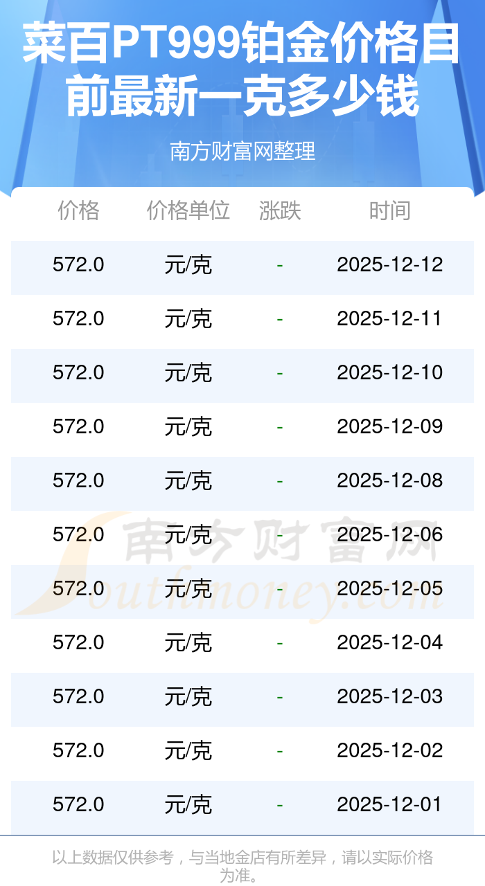 今日菜百 PT999铂金最新的克重售价为572.0元/克。