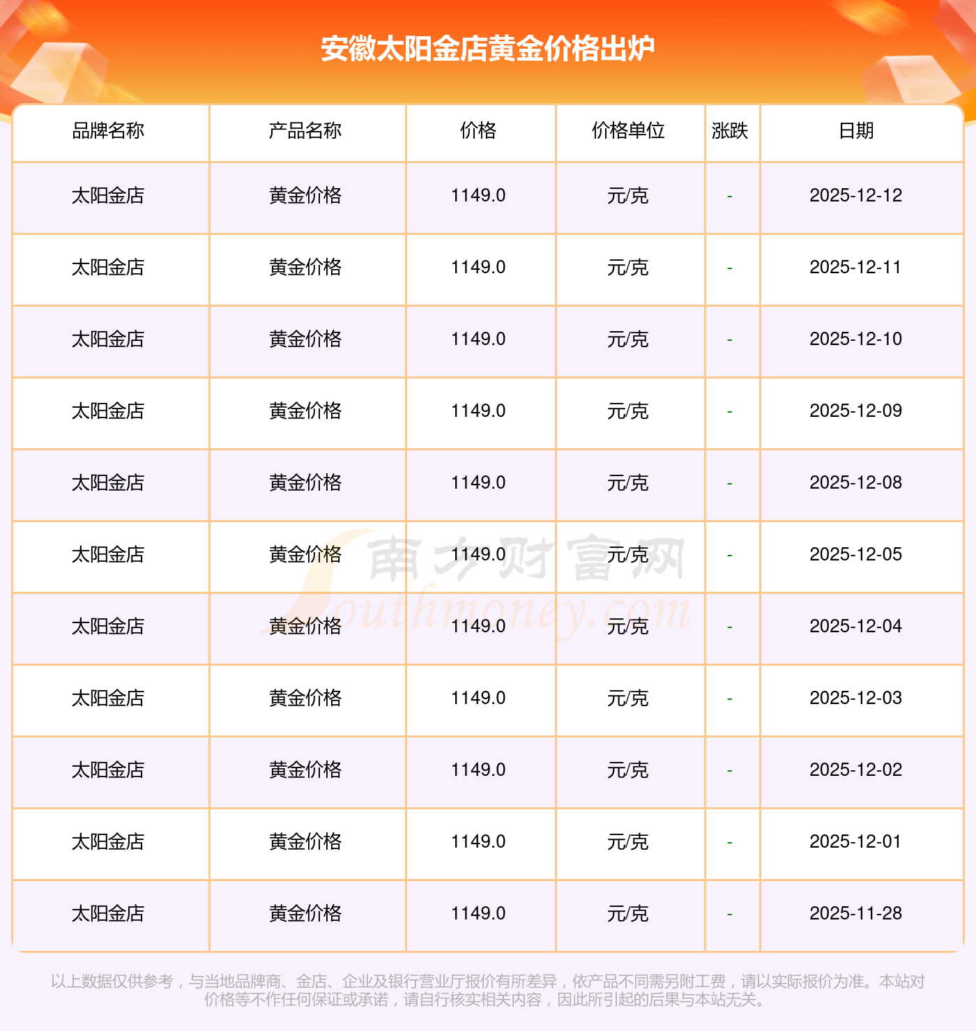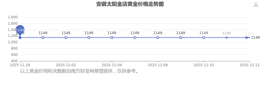 2025年12月14日,今日安徽太阳金店黄金价格:1149.0元/克。