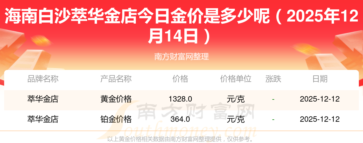 今天黄金价位是多少?现在一克黄金的价格是多少呀?2025年12月14日海南白沙萃华金店黄金的单价,一克为多少?黄金价格1336.0元/克,铂金价格681.0元/克,黄金价格1337.0元/克,铂金价格650.0元/克,黄金价格1339.0元/克,铂金价格600.0元/克,黄金价格1338.0元/克,铂金价格681.0元/克,饰品金价(内地)1336.0元/克,黄金饰品(香港)47410.0,铂金价格(香港)19550.0。