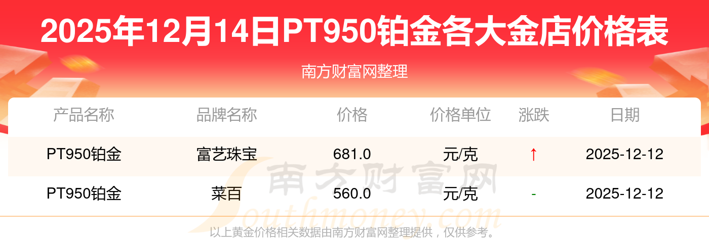 2025年12月14日,周大福、周大福、老凤祥、老凤祥、老庙、老庙、周生生、周生生、周大福、周大福、周大福等各大金店品牌PT950铂金今日价格如下:周大福1336.0元/克、周大福681.0元/克、老凤祥1337.0元/克、老凤祥650.0元/克、老庙1339.0元/克、老庙600.0元/克、周生生1338.0元/克、周生生681.0元/克、周大福1336.0元/克、周大福47410.0、周大福19550.0。