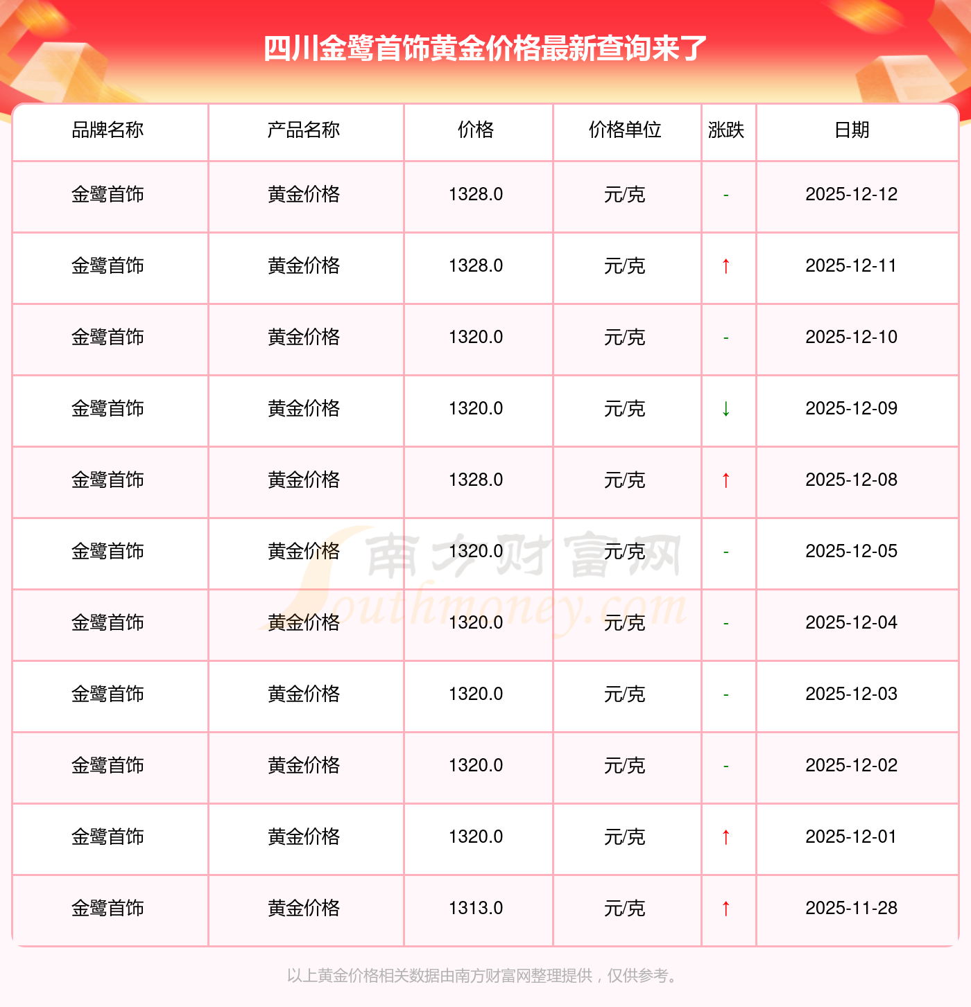 今日四川金鹭首饰黄金价格的价格为1328.0元/克。