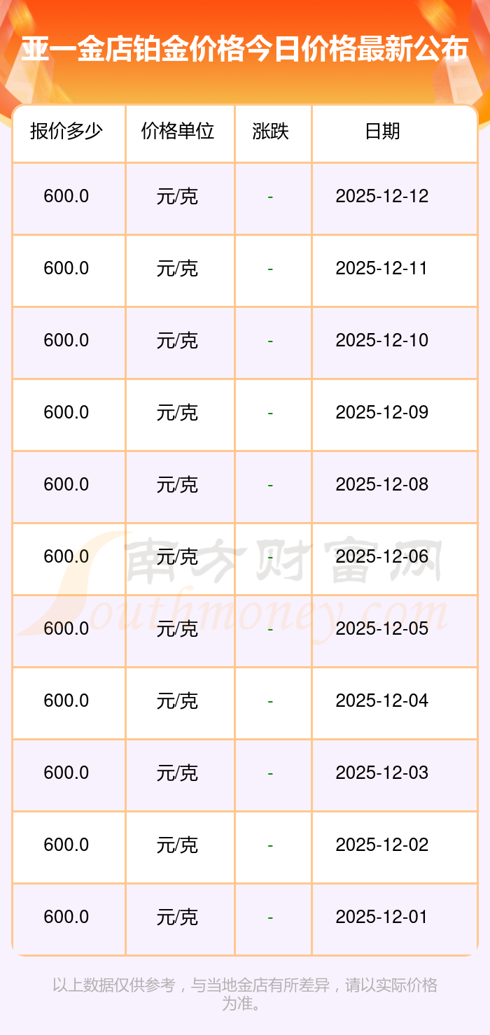 2025年12月14日亚一金店铂金价格:600.0元/克。
