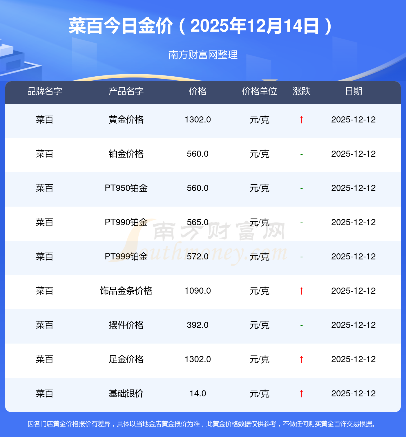 2025年12月14日,周大福、周大福、老凤祥、老凤祥、老庙、老庙、周生生、周生生、周大福、周大福、周大福等各大金店品牌PT990铂金今日价格如下:周大福1336.0元/克、周大福681.0元/克、老凤祥1337.0元/克、老凤祥650.0元/克、老庙1339.0元/克、老庙600.0元/克、周生生1338.0元/克、周生生681.0元/克、周大福1336.0元/克、周大福47410.0、周大福19550.0。