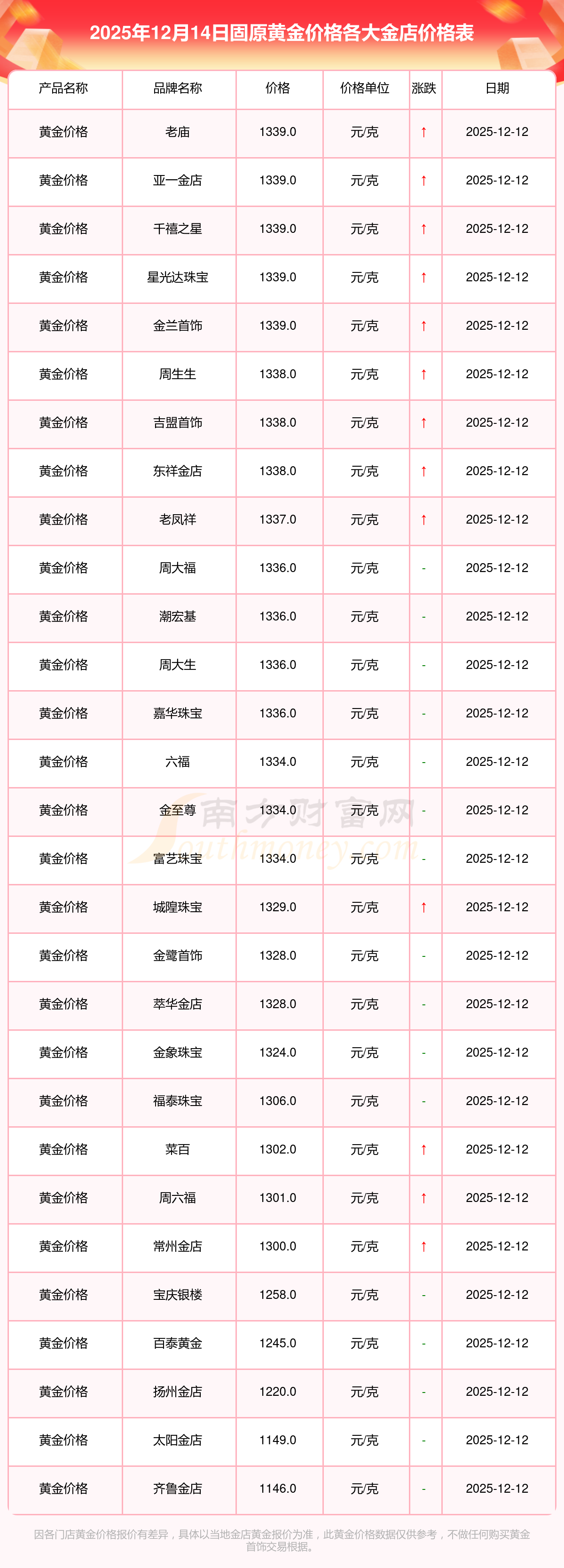 2025年12月14日固原周大福、周大福、老凤祥、老凤祥、老庙、老庙、周生生、周生生、周大福、周大福、周大福等各大金店品牌黄金价格最新价格如下:周大福黄金价格1336.0元/克,周大福铂金价格681.0元/克,老凤祥黄金价格1337.0元/克,老凤祥铂金价格650.0元/克,老庙黄金价格1339.0元/克,老庙铂金价格600.0元/克,周生生黄金价格1338.0元/克,周生生铂金价格681.0元/克,周大福饰品金价(内地)1336.0元/克,周大福黄金饰品(香港)47410.0,周大福铂金价格(香港)19550.0。