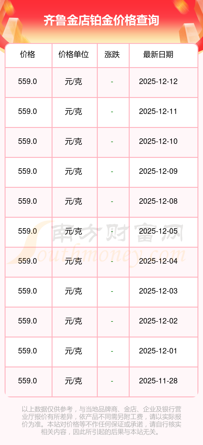 齐鲁金店 铂金价格于今日的最新挂牌价为559.0元/克。