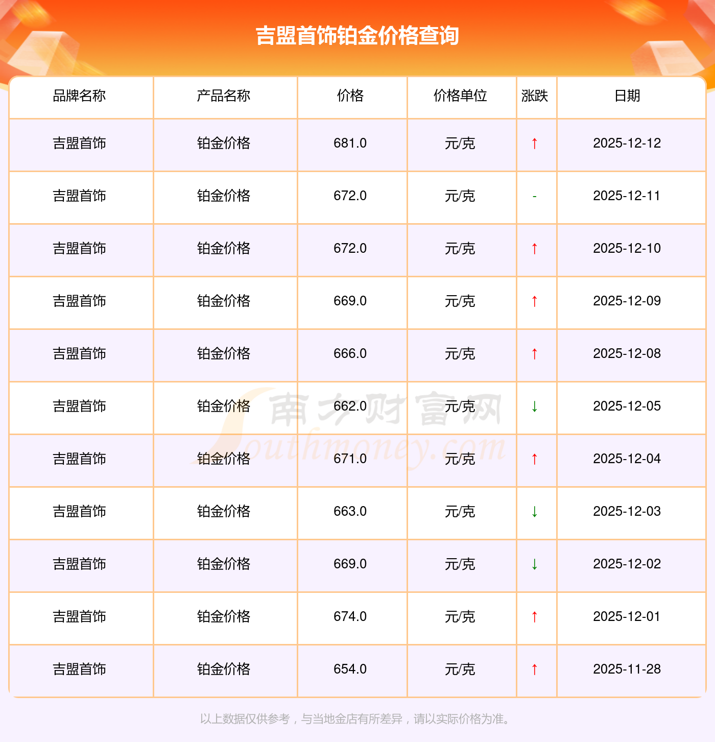 吉盟首饰 铂金价格在今日的最新价格显示为681.0元/克。