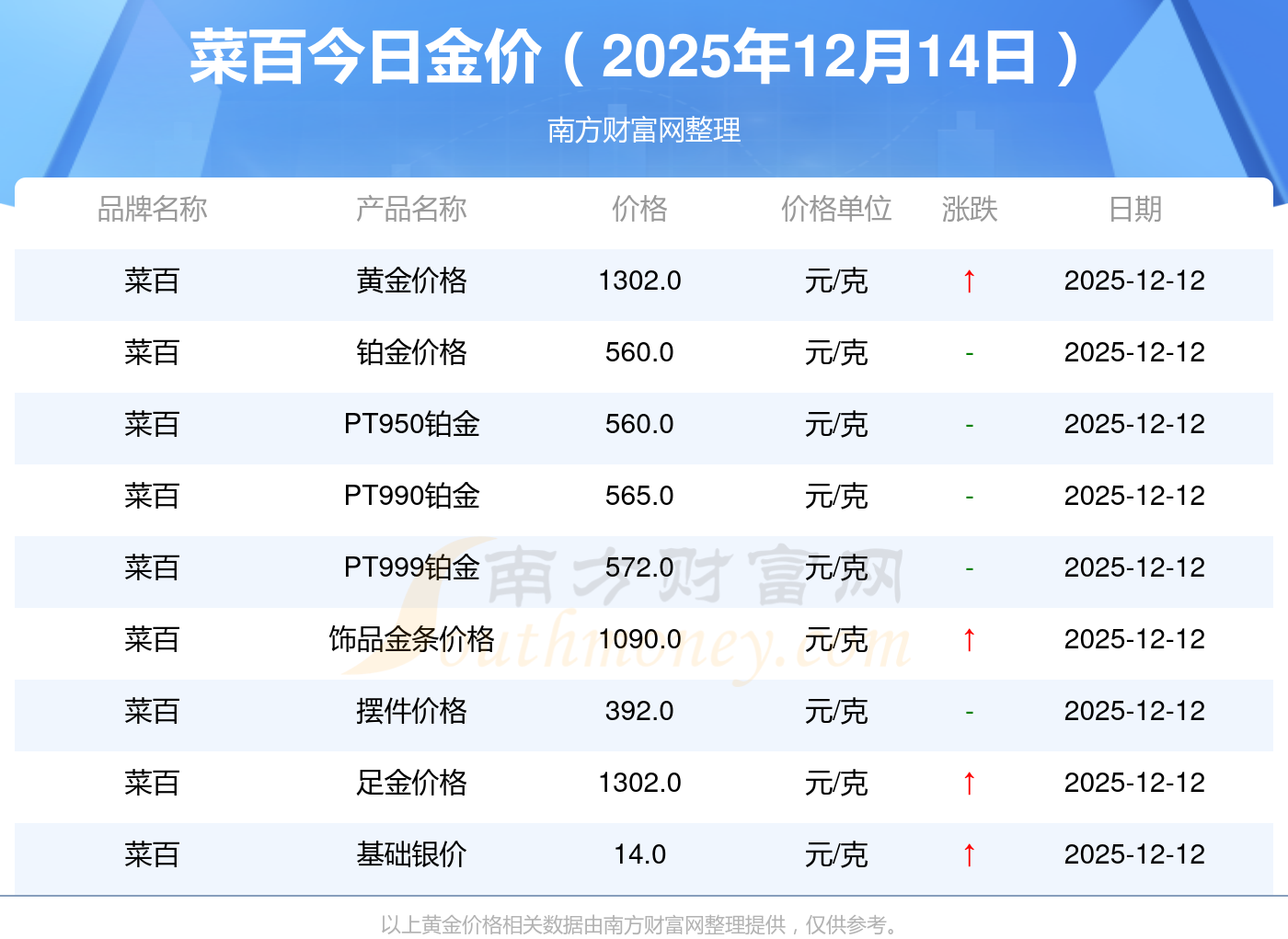 2025年12月14日菜百金价查询:黄金价格1336.0元/克,铂金价格681.0元/克,黄金价格1337.0元/克,铂金价格650.0元/克,黄金价格1339.0元/克,铂金价格600.0元/克,黄金价格1338.0元/克,铂金价格681.0元/克,饰品金价(内地)1336.0元/克,黄金饰品(香港)47410.0,铂金价格(香港)19550.0。