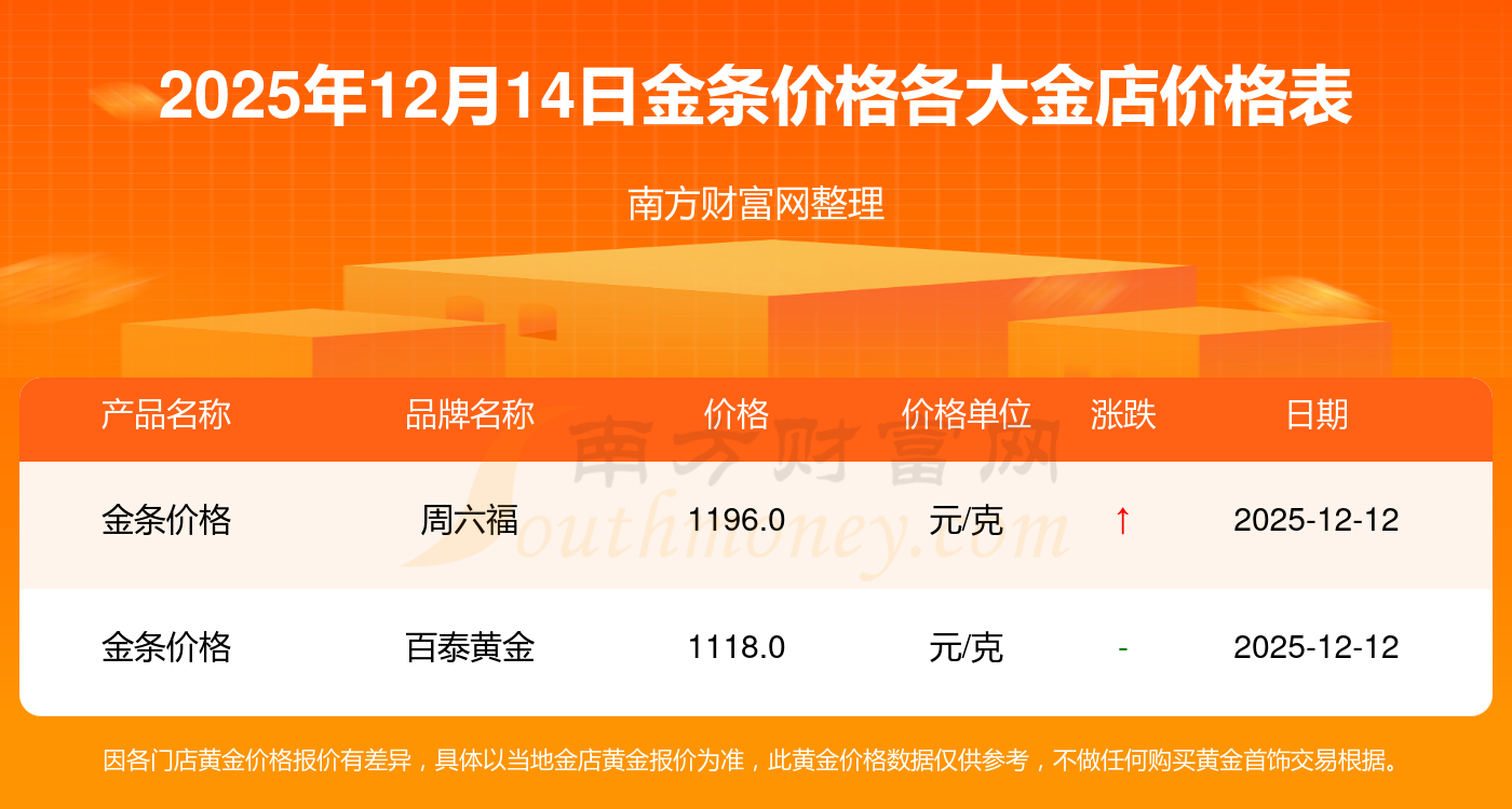 2025年12月14日周大福、周大福、老凤祥、老凤祥、老庙、老庙、周生生、周生生、周大福、周大福、周大福等各大金店品牌金条价格最新价格如下:周大福黄金价格1336.0元/克,周大福铂金价格681.0元/克,老凤祥黄金价格1337.0元/克,老凤祥铂金价格650.0元/克,老庙黄金价格1339.0元/克,老庙铂金价格600.0元/克,周生生黄金价格1338.0元/克,周生生铂金价格681.0元/克,周大福饰品金价(内地)1336.0元/克,周大福黄金饰品(香港)47410.0,周大福铂金价格(香港)19550.0。