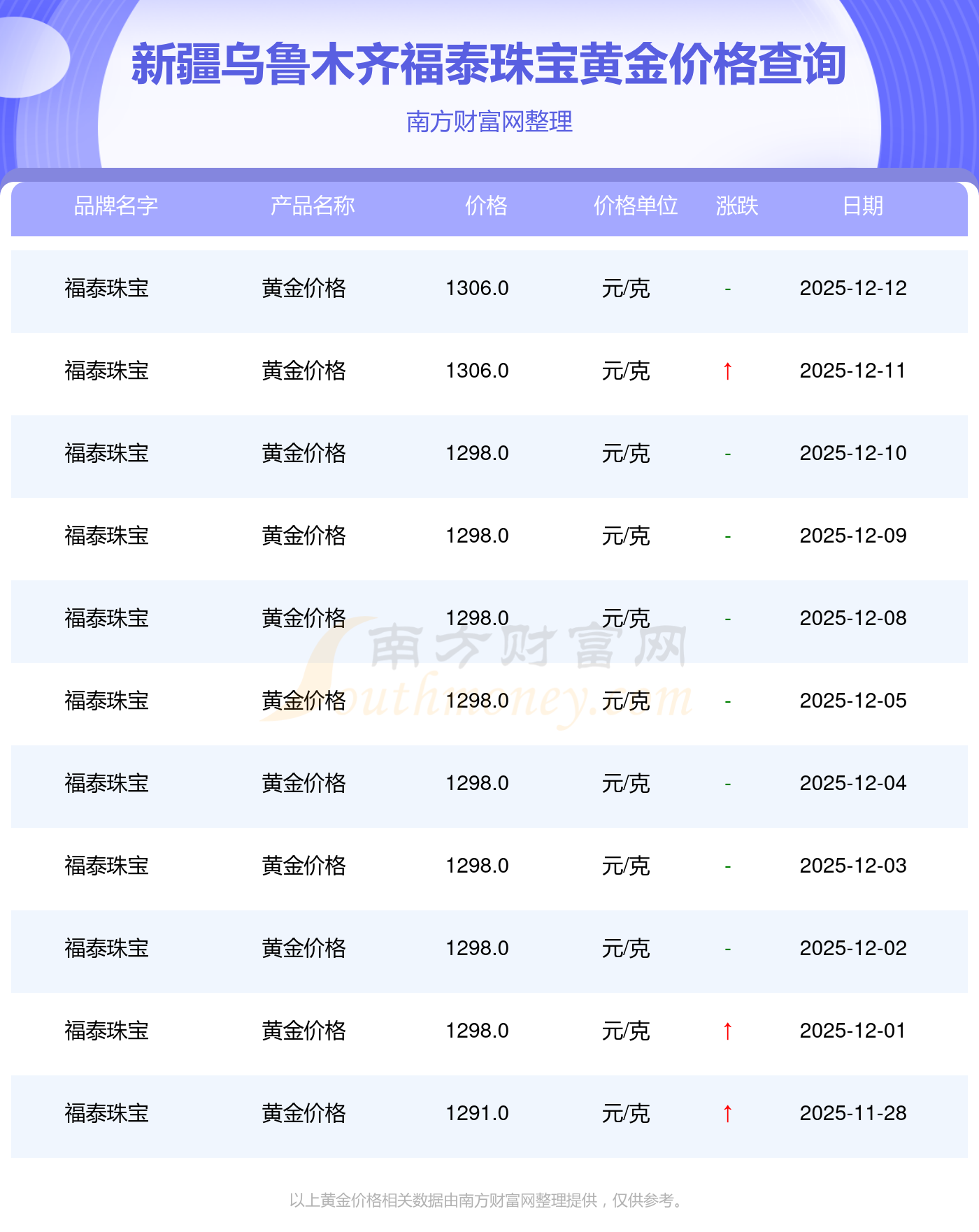 2025年12月14日新疆乌鲁木齐福泰珠宝黄金价格是1306.0元/克。