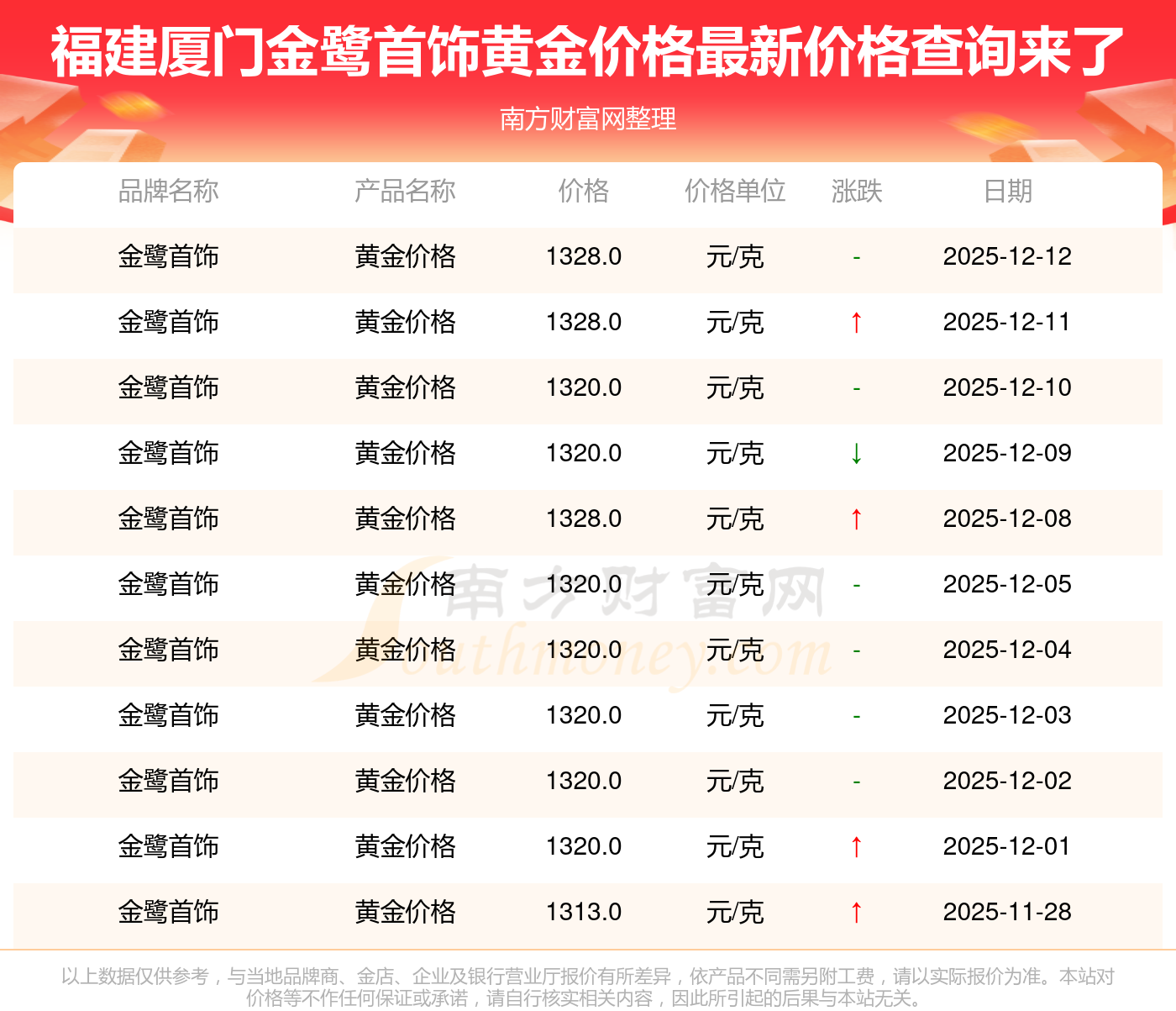 今天是2025年12月14日,周大福、周大福、老凤祥、老凤祥、老庙、老庙、周生生、周生生、周大福、周大福、周大福等各大金店品牌黄金价格最新价格如下:周大福1336.0元/克、周大福681.0元/克、老凤祥1337.0元/克、老凤祥650.0元/克、老庙1339.0元/克、老庙600.0元/克、周生生1338.0元/克、周生生681.0元/克、周大福1336.0元/克、周大福47410.0、周大福19550.0。