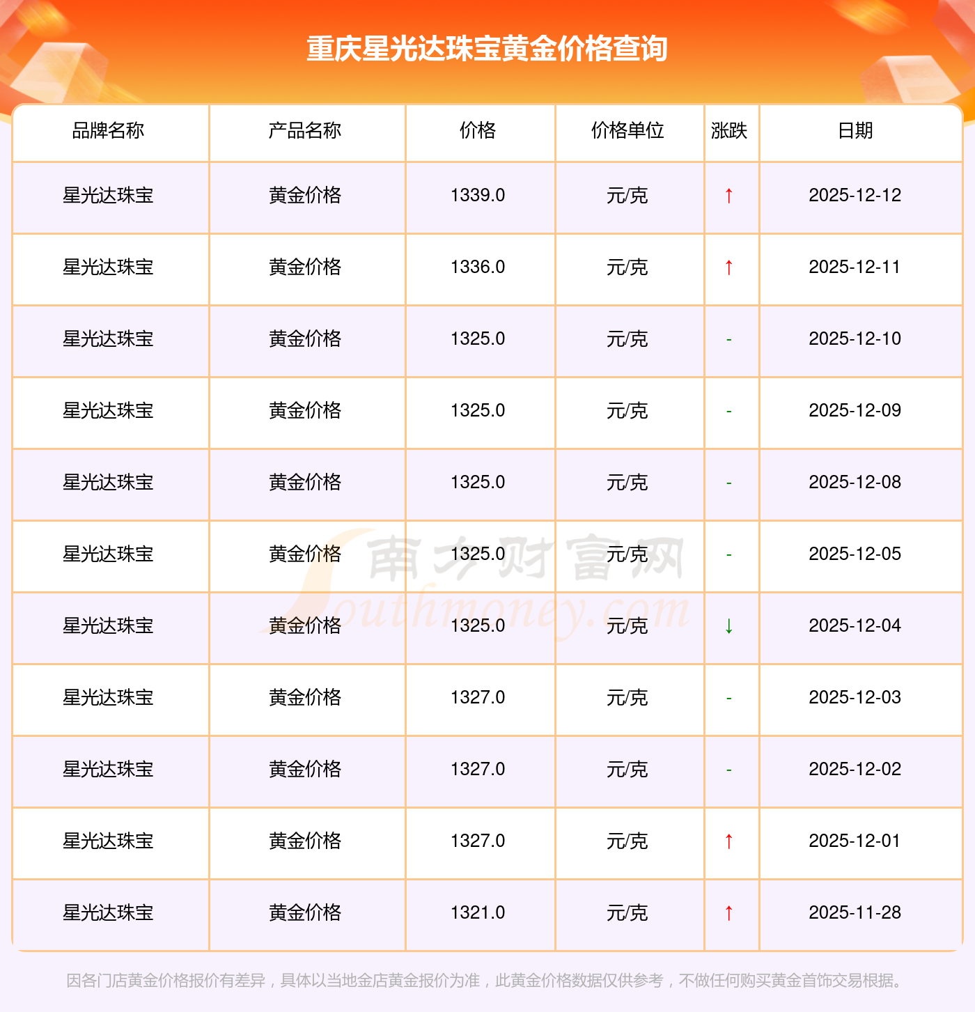 重庆星光达珠宝在 2025年12月14日,黄金价格的售卖价格是 1339.0元/克。