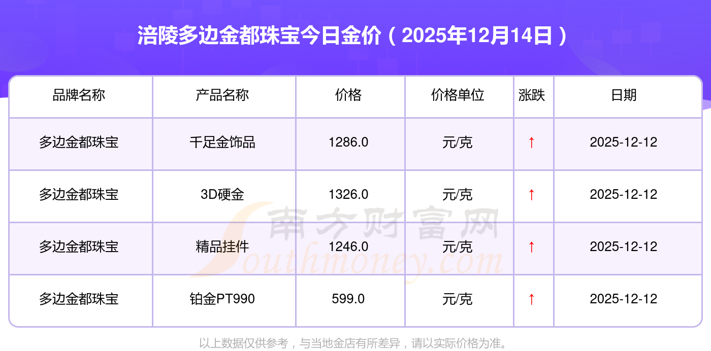 2025年12月14日涪陵多边金都珠宝金价查询:黄金价格1336.0元/克,铂金价格681.0元/克,黄金价格1337.0元/克,铂金价格650.0元/克,黄金价格1339.0元/克,铂金价格600.0元/克,黄金价格1338.0元/克,铂金价格681.0元/克,饰品金价(内地)1336.0元/克,黄金饰品(香港)47410.0,铂金价格(香港)19550.0。