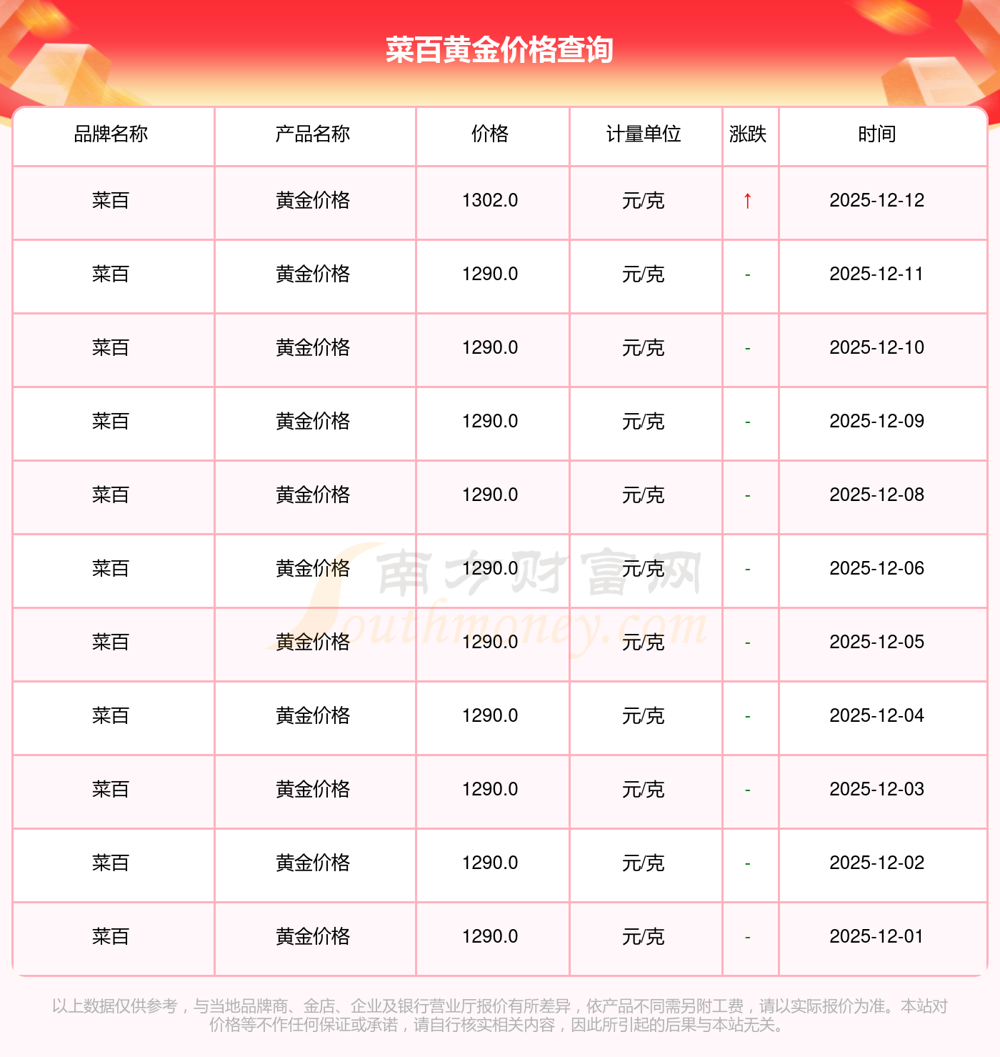 菜百 黄金价格于今日的最新挂牌价为1302.0元/克。