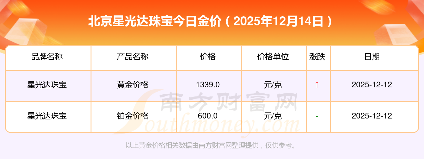 想查询当下黄金价格,今日黄金一克的价格是多少呢?2025年12月14日北京星光达珠宝一克黄金的售价是多少:黄金价格1336.0元/克,铂金价格681.0元/克,黄金价格1337.0元/克,铂金价格650.0元/克,黄金价格1339.0元/克,铂金价格600.0元/克,黄金价格1338.0元/克,铂金价格681.0元/克,饰品金价(内地)1336.0元/克,黄金饰品(香港)47410.0,铂金价格(香港)19550.0。