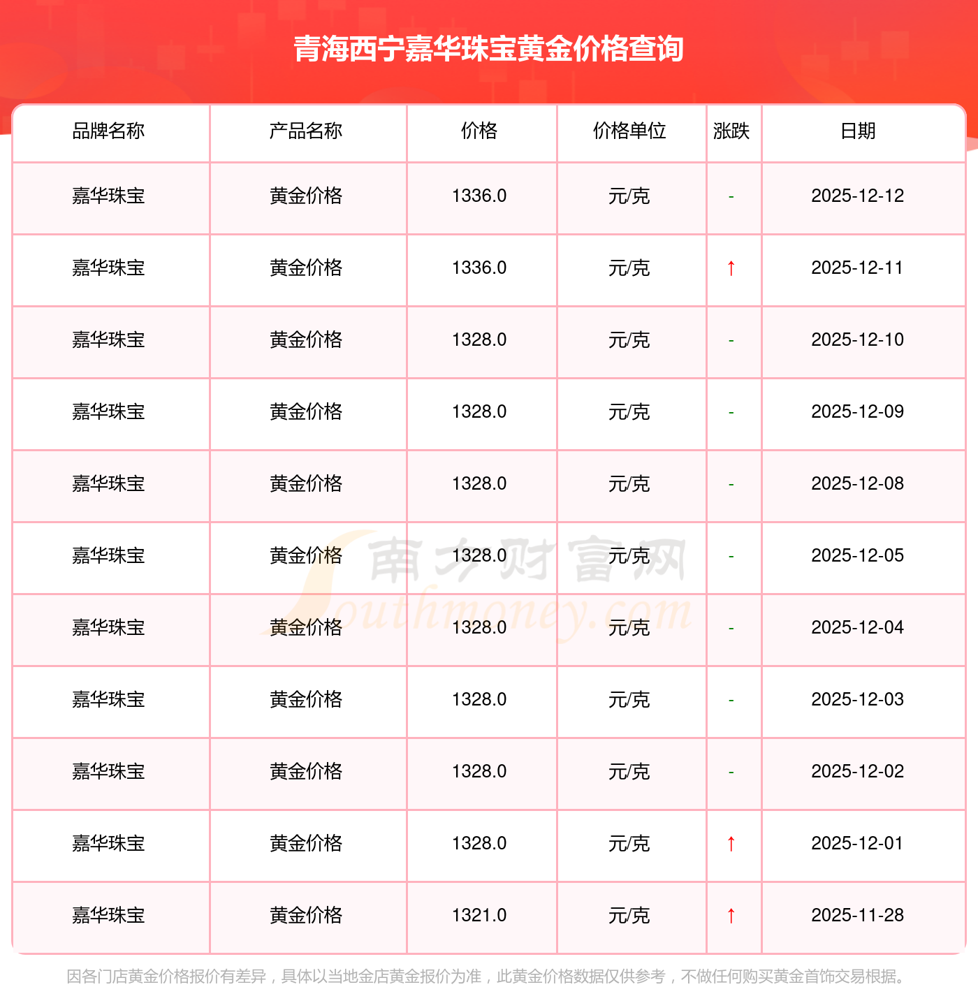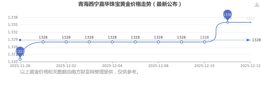 今日青海西宁嘉华珠宝黄金价格:1336.0元/克。