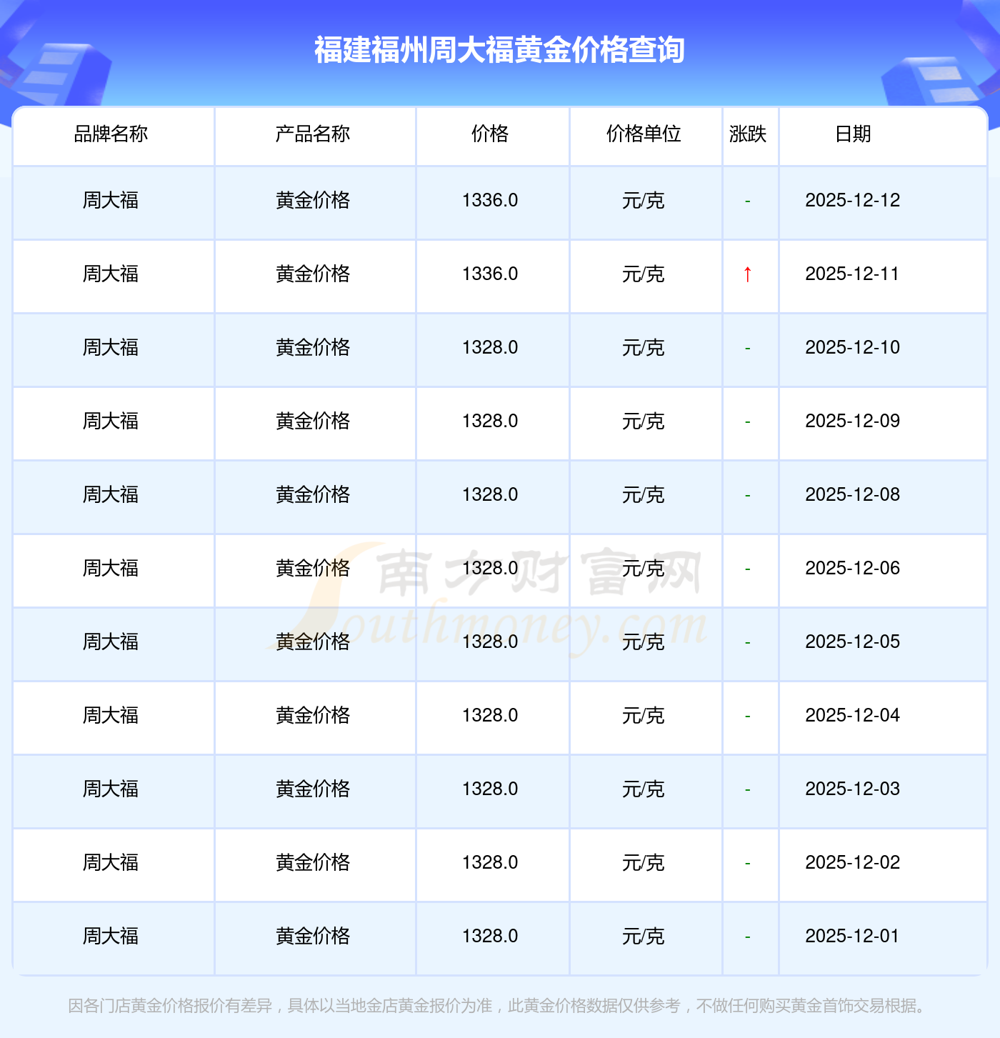 今日(2025年12月14日)福建福州周大福黄金价格是1336.0元/克。