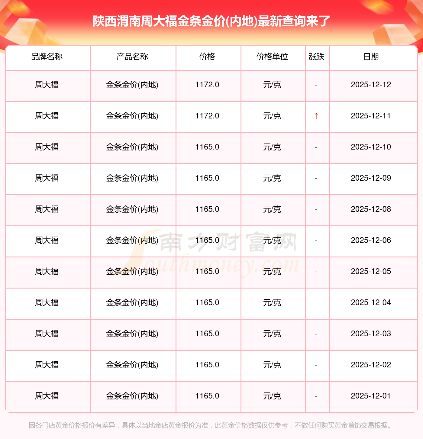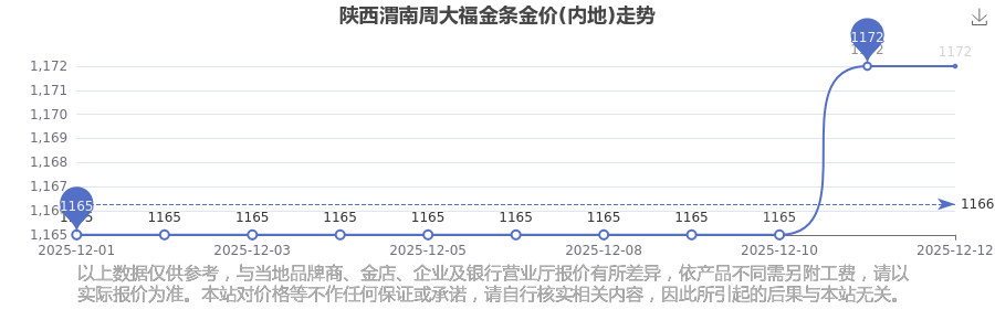 2025年12月14日陕西渭南周大福金条金价(内地)是1172.0元/克。