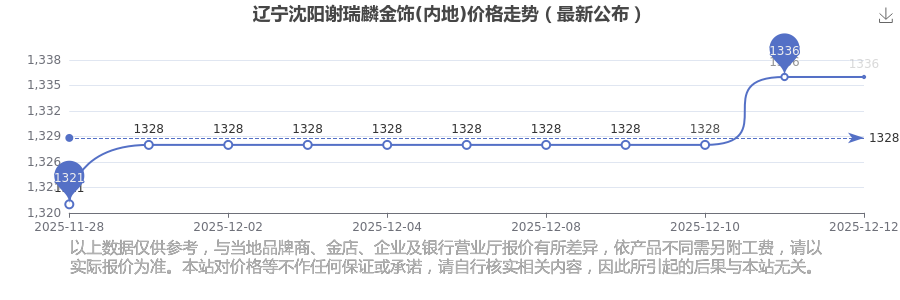 1336.0元/克的金饰(内地)价格,是辽宁沈阳谢瑞麟在 2025年12月14日给出的。