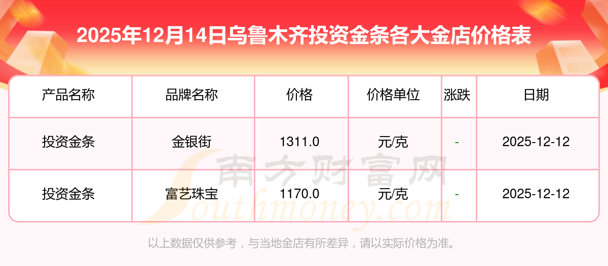 目前,乌鲁木齐投资金条最高的金店为金银街,报价1311.0元/克。而投资金条最低的金店是富艺珠宝,报价1170.0元/克。今日投资金条高低差为141元/克。