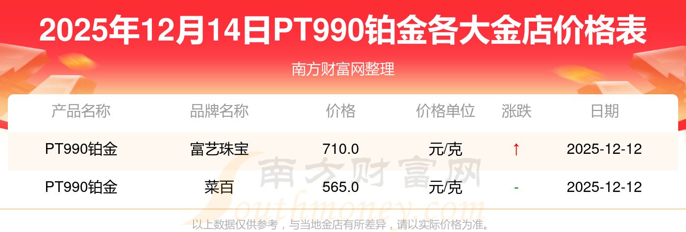 今天是2025年12月14日,周大福、周大福、老凤祥、老凤祥、老庙、老庙、周生生、周生生、周大福、周大福、周大福等各大金店品牌PT990铂金最新价格如下:周大福1336.0元/克、周大福681.0元/克、老凤祥1337.0元/克、老凤祥650.0元/克、老庙1339.0元/克、老庙600.0元/克、周生生1338.0元/克、周生生681.0元/克、周大福1336.0元/克、周大福47410.0、周大福19550.0。