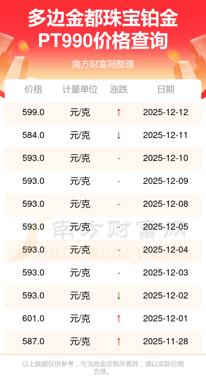 今日多边金都珠宝铂金PT990价格为599.0元/克。