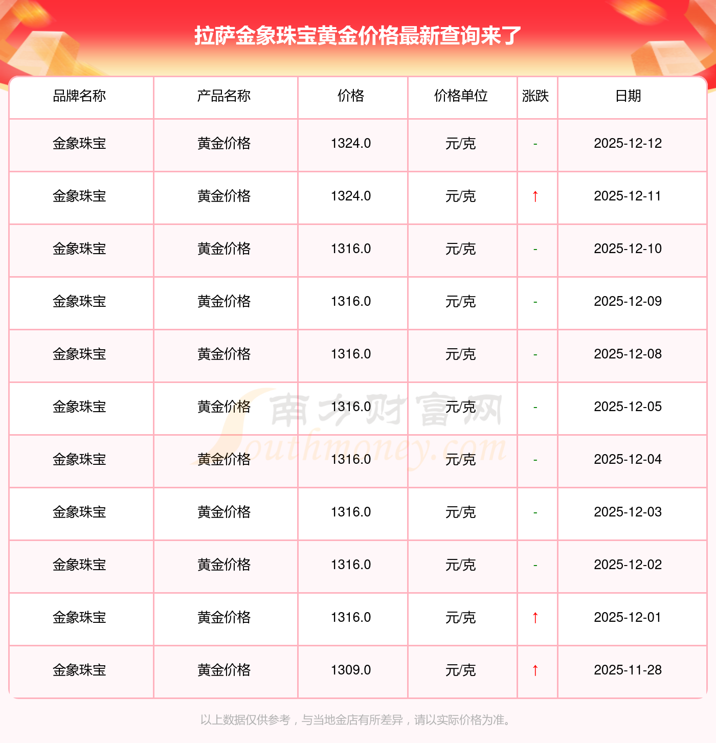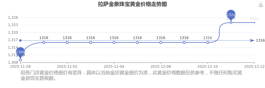 拉萨金象珠宝黄金价格现在每克多少钱?今日黄金一克需花费多少钱?今日拉萨金象珠宝黄金价格查询,2025年12月14日,拉萨金象珠宝的黄金价格标价达到 1324.0元/克。