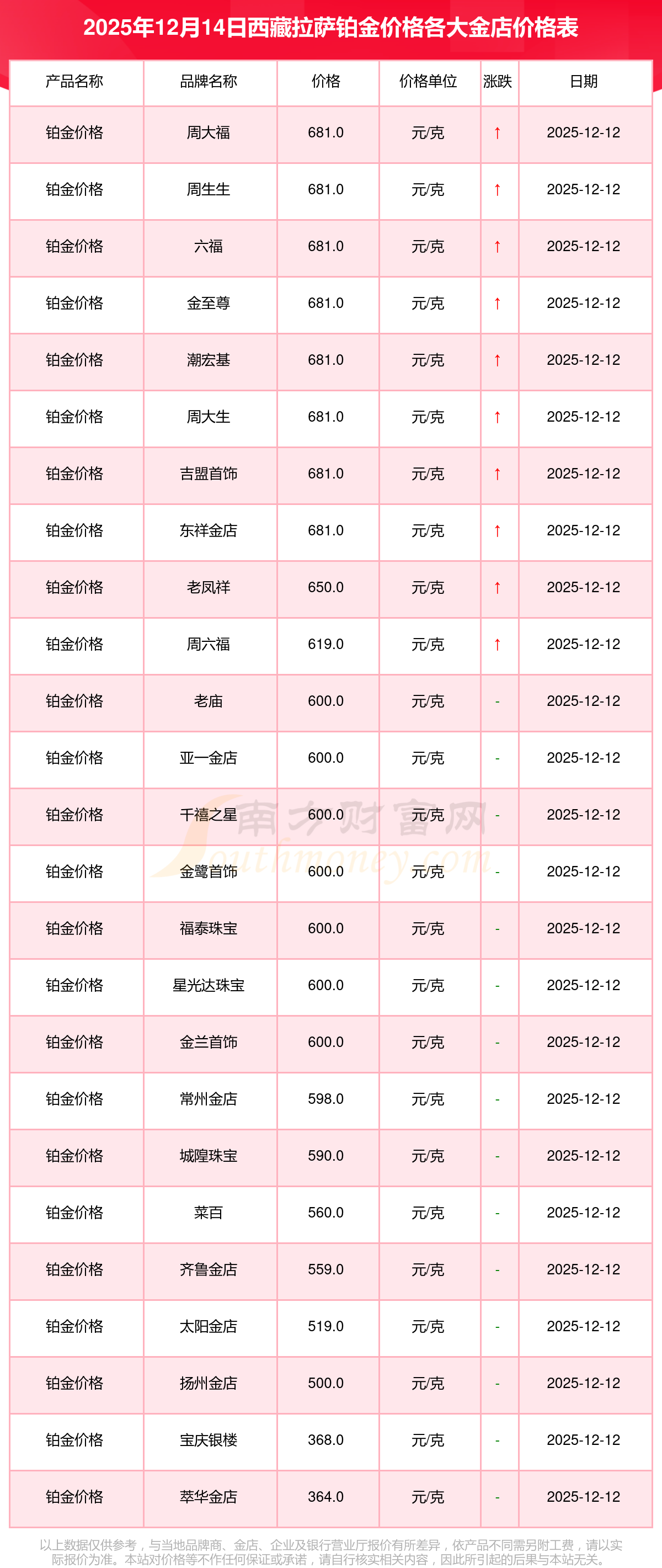 目前,西藏拉萨铂金价格最高的金店为周大福,报价681.0元/克。而铂金价格最低的金店是萃华金店,报价364.0元/克。今日铂金价格高低差为317元/克。