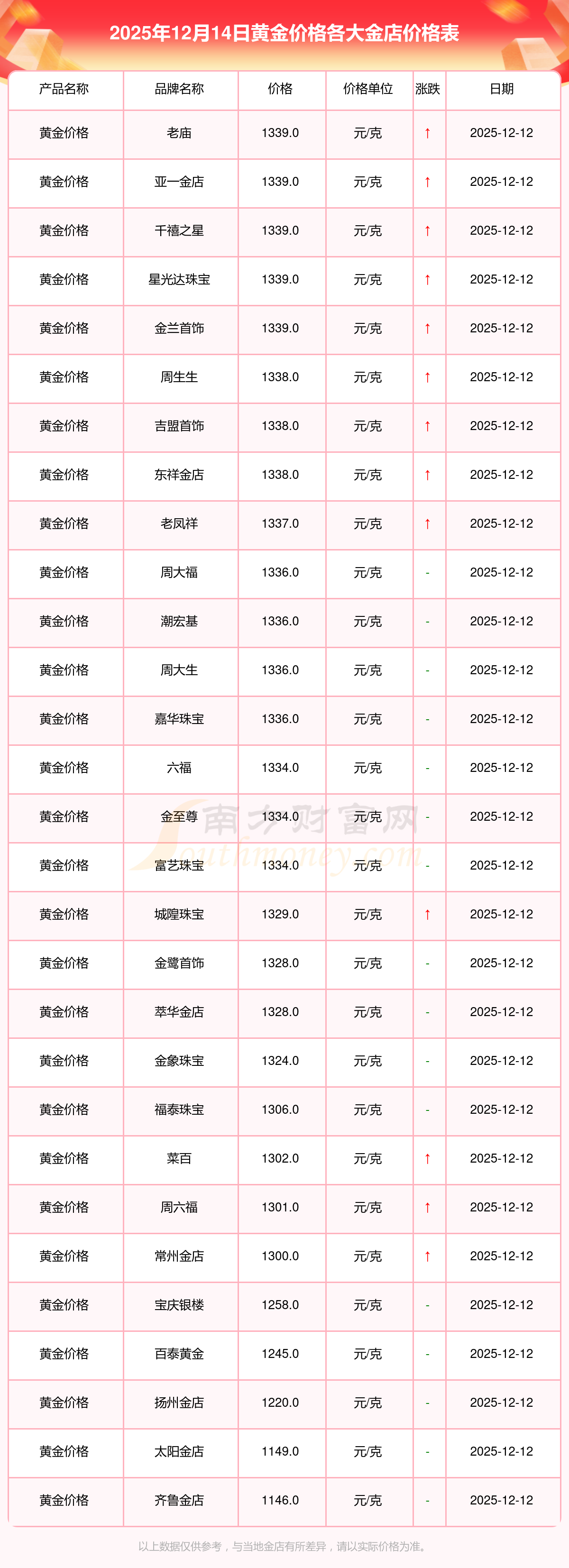 2025年12月14日周大福、周大福、老凤祥、老凤祥、老庙、老庙、周生生、周生生、周大福、周大福、周大福等各大金店品牌黄金价格最新价格如下:周大福黄金价格1336.0元/克,周大福铂金价格681.0元/克,老凤祥黄金价格1337.0元/克,老凤祥铂金价格650.0元/克,老庙黄金价格1339.0元/克,老庙铂金价格600.0元/克,周生生黄金价格1338.0元/克,周生生铂金价格681.0元/克,周大福饰品金价(内地)1336.0元/克,周大福黄金饰品(香港)47410.0,周大福铂金价格(香港)19550.0。