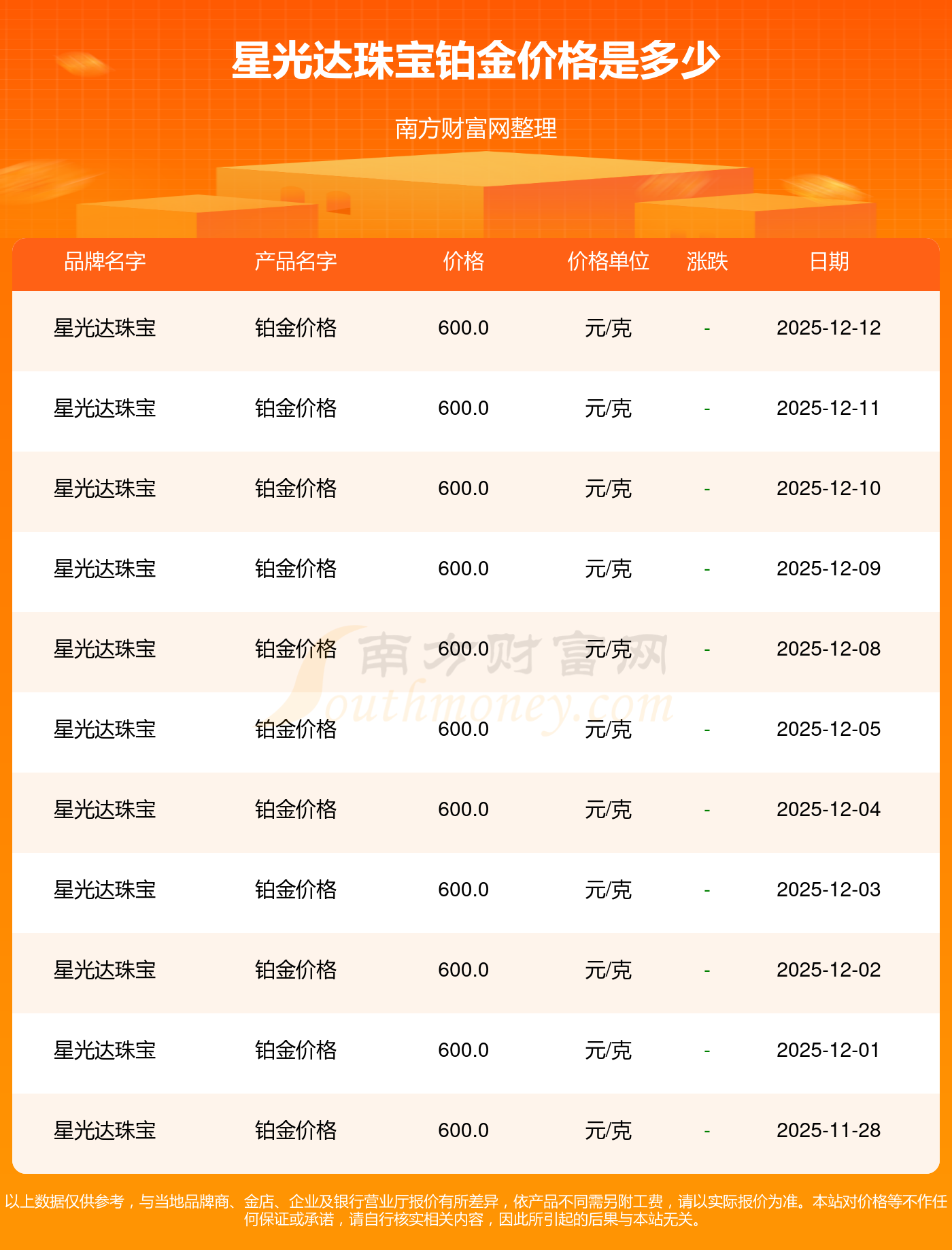 星光达珠宝今日铂金价格的最新市场行情价为600.0元/克。