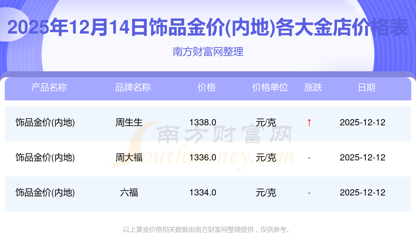 2025年12月14日周大福、周大福、老凤祥、老凤祥、老庙、老庙、周生生、周生生、周大福、周大福、周大福等各大金店品牌饰品金价(内地)最新价格如下:周大福黄金价格1336.0元/克,周大福铂金价格681.0元/克,老凤祥黄金价格1337.0元/克,老凤祥铂金价格650.0元/克,老庙黄金价格1339.0元/克,老庙铂金价格600.0元/克,周生生黄金价格1338.0元/克,周生生铂金价格681.0元/克,周大福饰品金价(内地)1336.0元/克,周大福黄金饰品(香港)47410.0,周大福铂金价格(香港)19550.0。