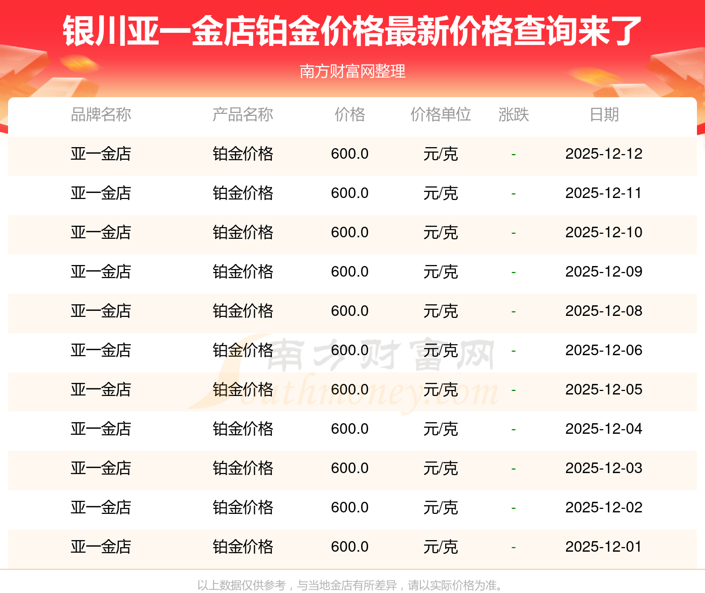 600.0元/克,此乃银川亚一金店于 2025年12月14日铂金价格的挂牌价格。
