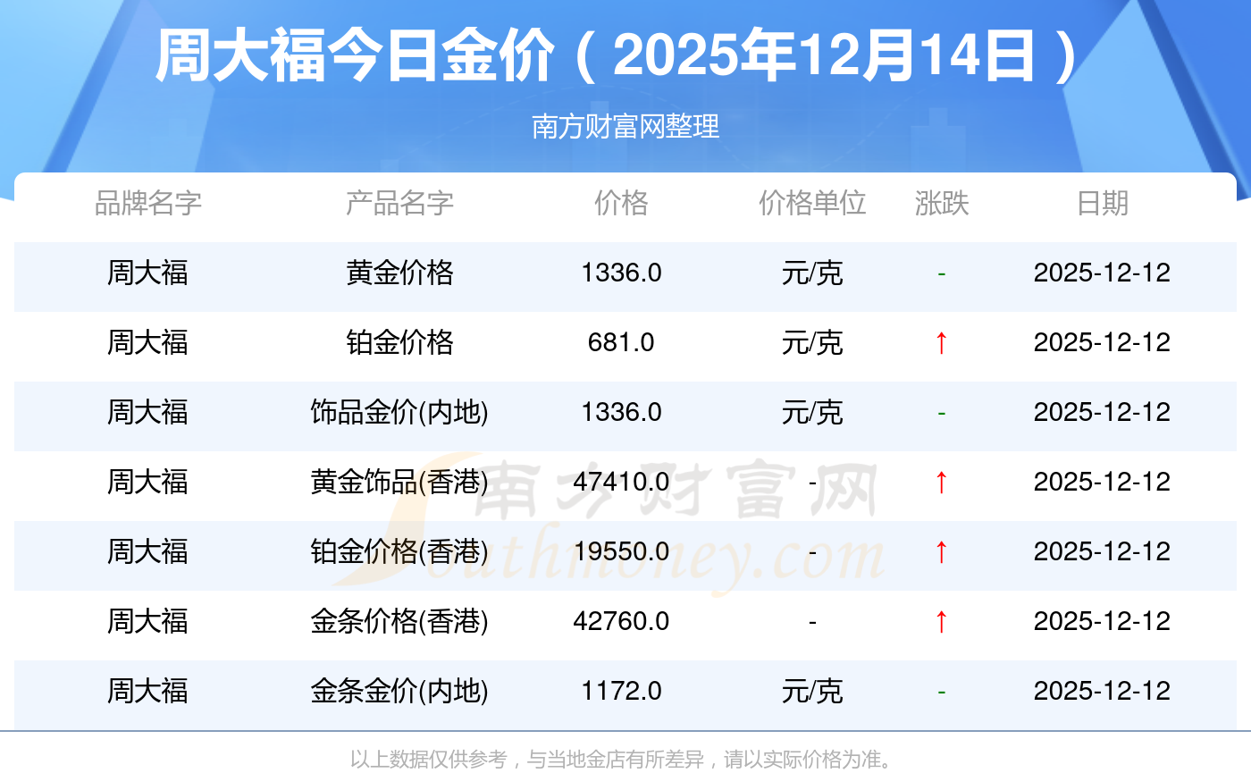 2025年12月14日,周大福、周大福、老凤祥、老凤祥、老庙、老庙、周生生、周生生、周大福、周大福、周大福等各大金店品牌黄金价格今日价格如下:周大福1336.0元/克、周大福681.0元/克、老凤祥1337.0元/克、老凤祥650.0元/克、老庙1339.0元/克、老庙600.0元/克、周生生1338.0元/克、周生生681.0元/克、周大福1336.0元/克、周大福47410.0、周大福19550.0。