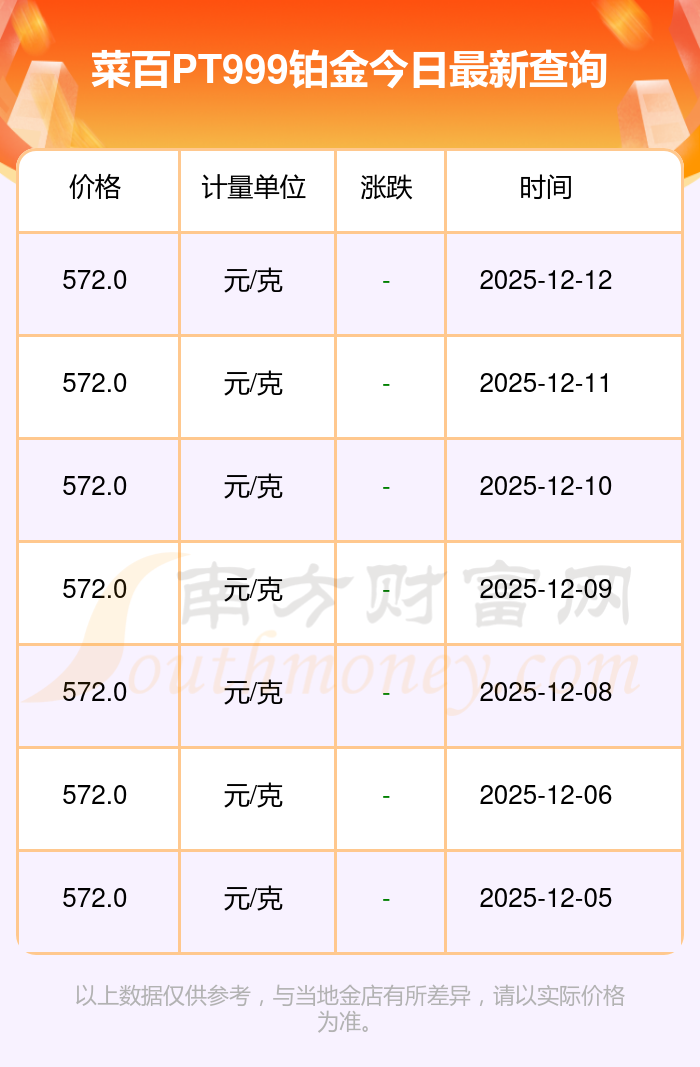 572.0元/克的价格,是菜百今日 PT999铂金的最新行情。