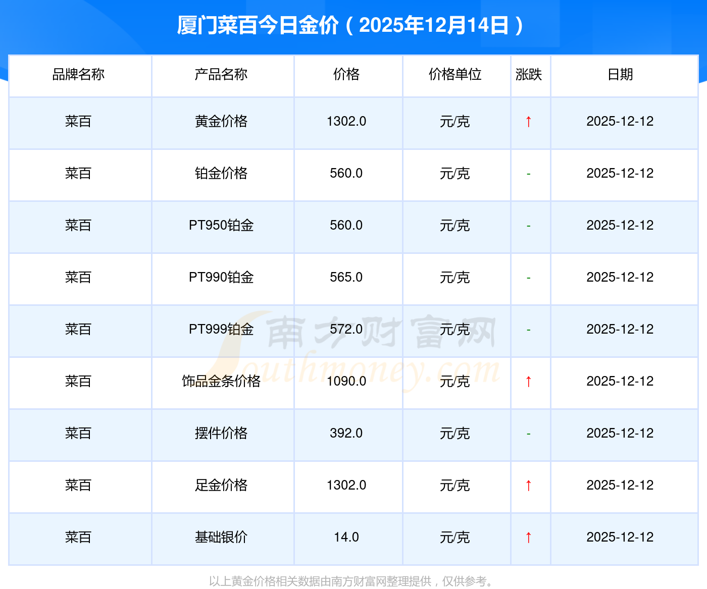 2025年12月14日厦门菜百金价查询:黄金价格1336.0元/克,铂金价格681.0元/克,黄金价格1337.0元/克,铂金价格650.0元/克,黄金价格1339.0元/克,铂金价格600.0元/克,黄金价格1338.0元/克,铂金价格681.0元/克,饰品金价(内地)1336.0元/克,黄金饰品(香港)47410.0,铂金价格(香港)19550.0。