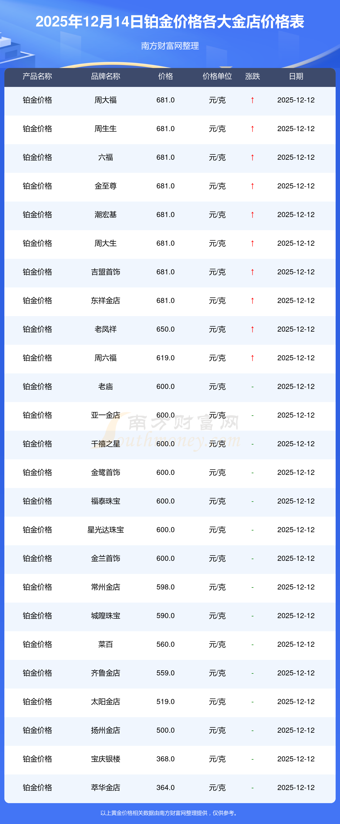 2025年12月14日各大金店铂金价格最新价格:周大福1336.0元/克,周大福681.0元/克,老凤祥1337.0元/克,老凤祥650.0元/克,老庙1339.0元/克,老庙600.0元/克,周生生1338.0元/克,周生生681.0元/克,周大福1336.0元/克,周大福47410.0,周大福19550.0。
