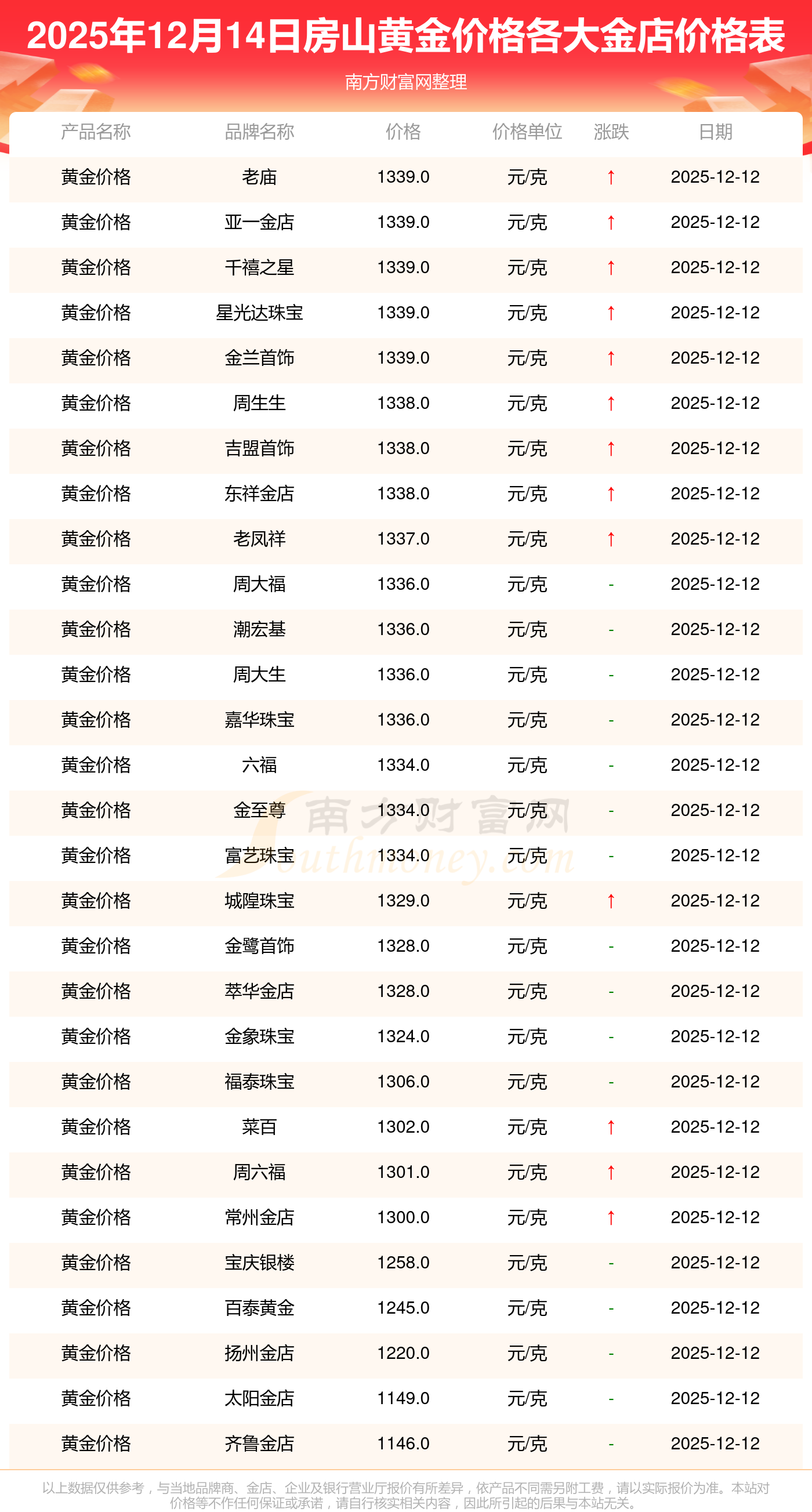 今天是2025年12月14日,房山周大福、周大福、老凤祥、老凤祥、老庙、老庙、周生生、周生生、周大福、周大福、周大福等各大金店品牌黄金价格最新价格行情是这样的:周大福1336.0元/克、周大福681.0元/克、老凤祥1337.0元/克、老凤祥650.0元/克、老庙1339.0元/克、老庙600.0元/克、周生生1338.0元/克、周生生681.0元/克、周大福1336.0元/克、周大福47410.0、周大福19550.0。