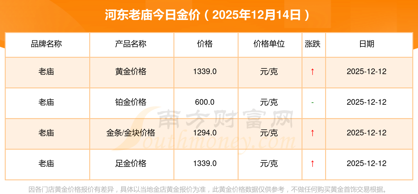 今日黄金售价多少?现在黄金一克值多少钱呢?2025年12月14日河东老庙今日价格:黄金价格1336.0元/克,铂金价格681.0元/克,黄金价格1337.0元/克,铂金价格650.0元/克,黄金价格1339.0元/克,铂金价格600.0元/克,黄金价格1338.0元/克,铂金价格681.0元/克,饰品金价(内地)1336.0元/克,黄金饰品(香港)47410.0,铂金价格(香港)19550.0。