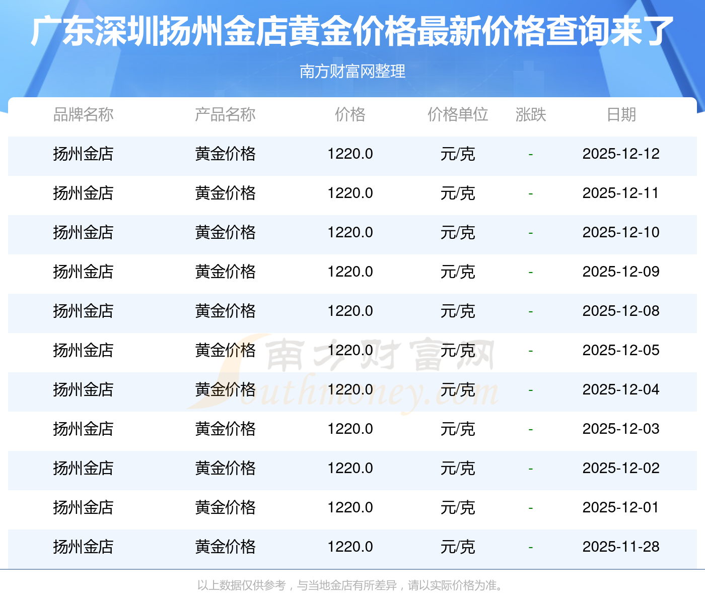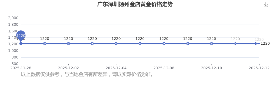 今日广东深圳扬州金店黄金价格为1220.0元/克。