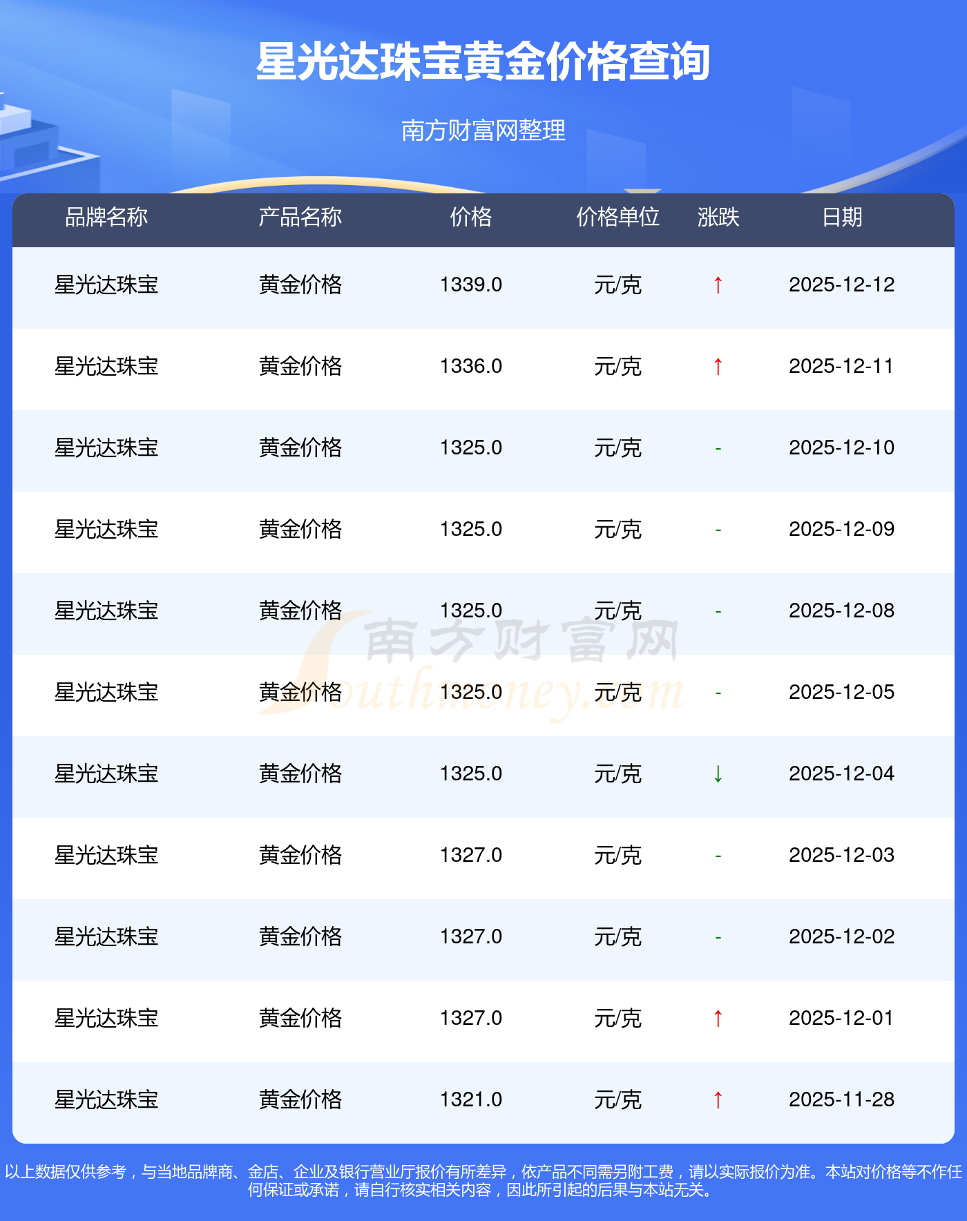 想了解今日黄金价格,现在每克黄金的价格是多少呢?黄金是一种优良的导电导热材料,具有良好的导热特性。黄金常用于电子工业中的特殊电路设计,因其化学稳定性高、抗氧化性强,可制作高精度电子元件。今日(2025年12月14日),星光达珠宝黄金价格最新价格为1339.0元/克。