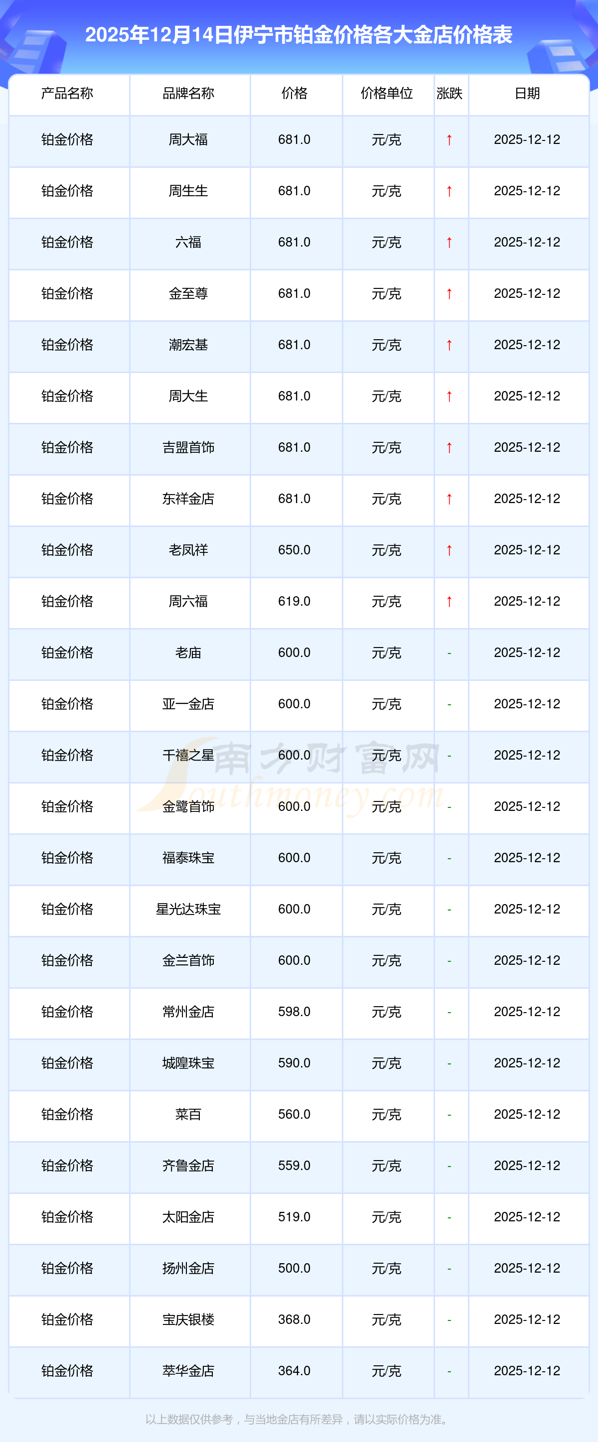 今日伊宁市铂金价格最高的金店是周大福,报价681.0元/克,铂金价格最低的金店是萃华金店,报价364.0元/克。今日铂金价格高低差为317元/克。