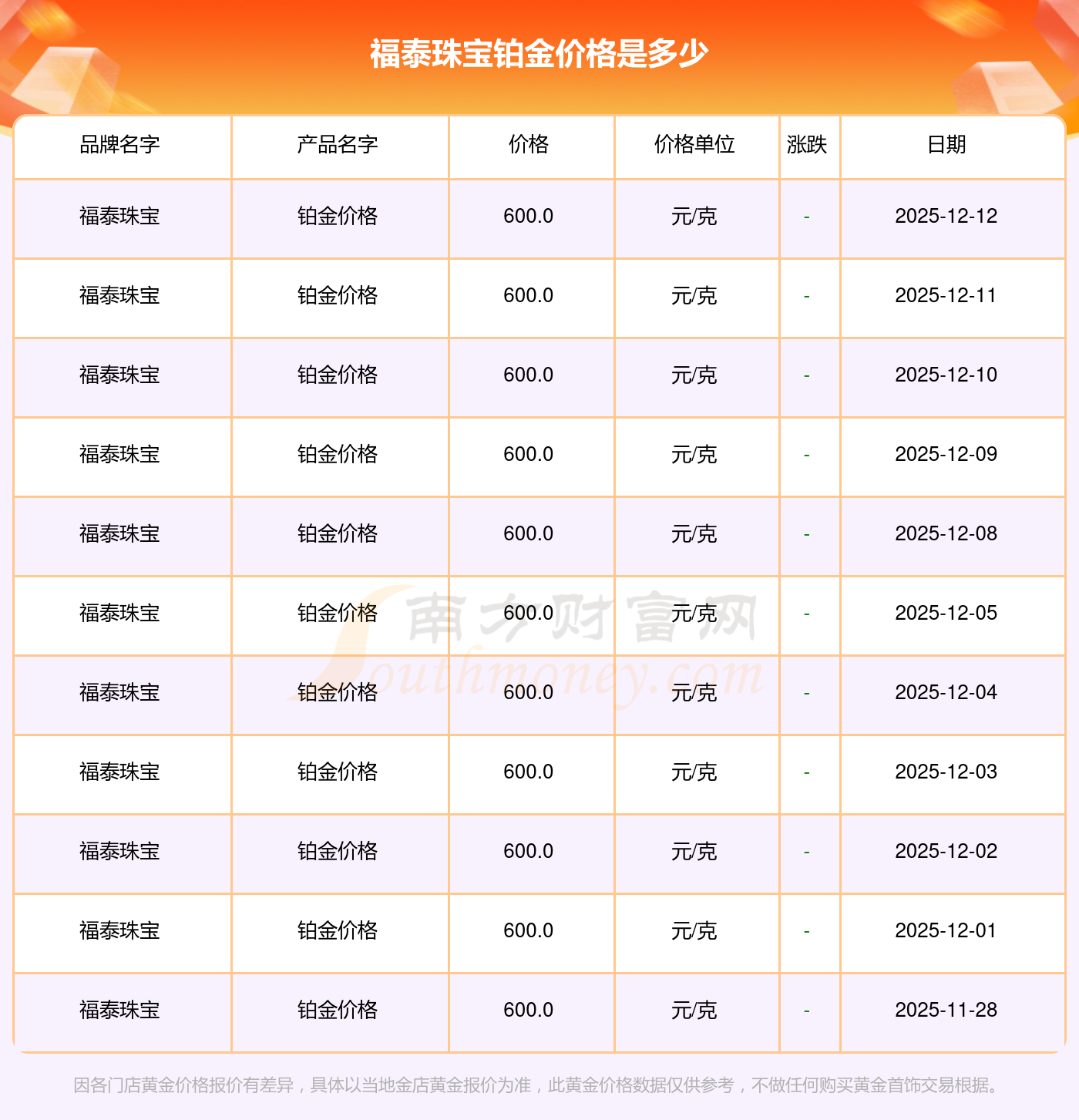 2025年12月14日福泰珠宝铂金价格查询:600.0元/克。