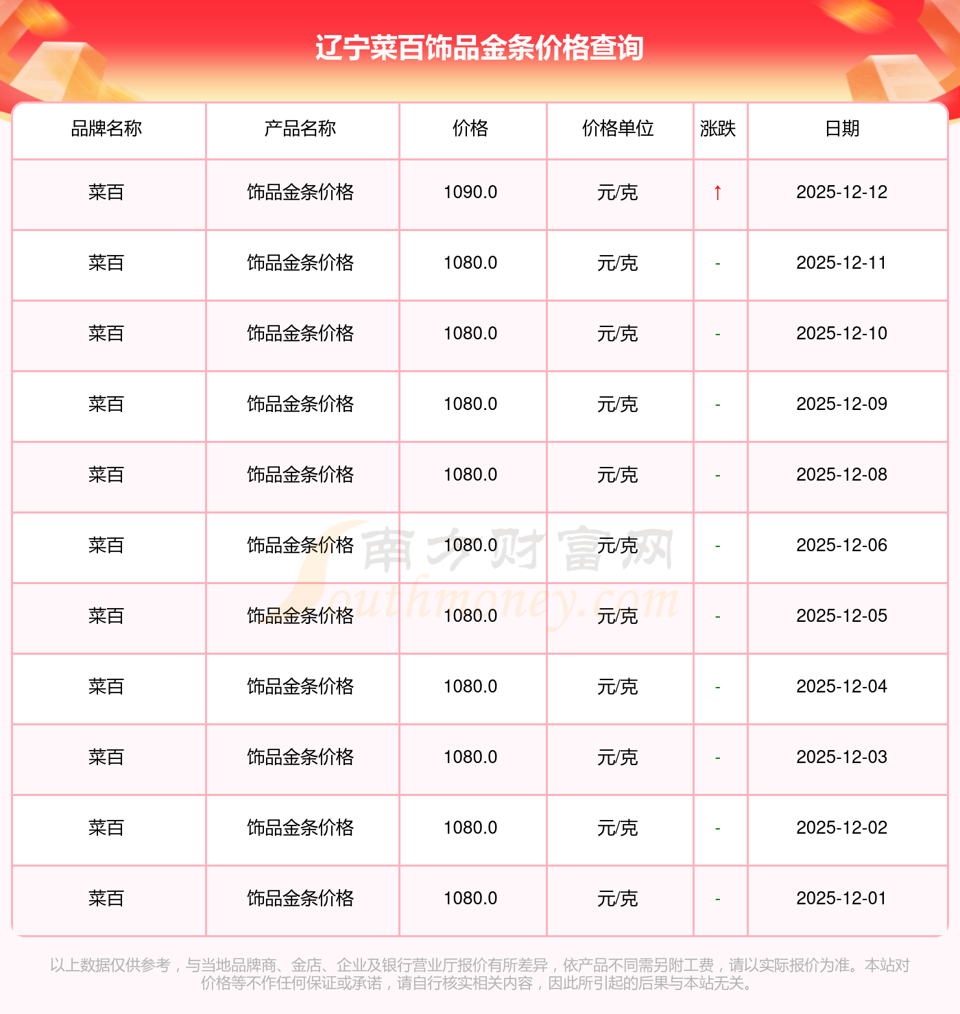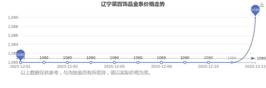 于 2025年12月14日,辽宁菜百饰品金条价格的克价为1090.0元/克。
